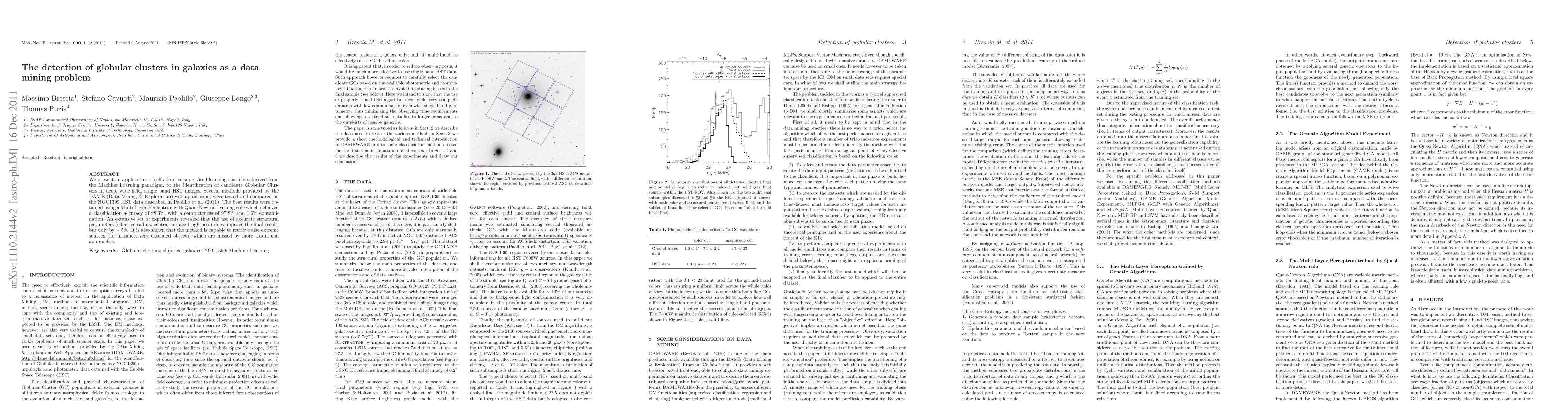 We present an application of self-adaptive supervised learning classifiers derived from the Machine Learning paradigm, to the identification of candidate Globular Clusters in deep, wide-field, single band HST images. Several methods provided by the DAME (Data Mining & Exploration) web application, were tested and compared on the NGC1399 HST data described in Paolillo 2011. The best results were obtained using a Multi Layer Perceptron with Quasi Newton learning rule which achieved a classification accuracy of 98.3%, with a completeness of 97.8% and 1.6% of contamination. An extensive set of experiments revealed that the use of accurate structural parameters (effective radius, central surface brightness) does improve the final result, but only by 5%. It is also shown that the method is capable to retrieve also extreme sources (for instance, very extended objects) which are missed by more traditional approaches.