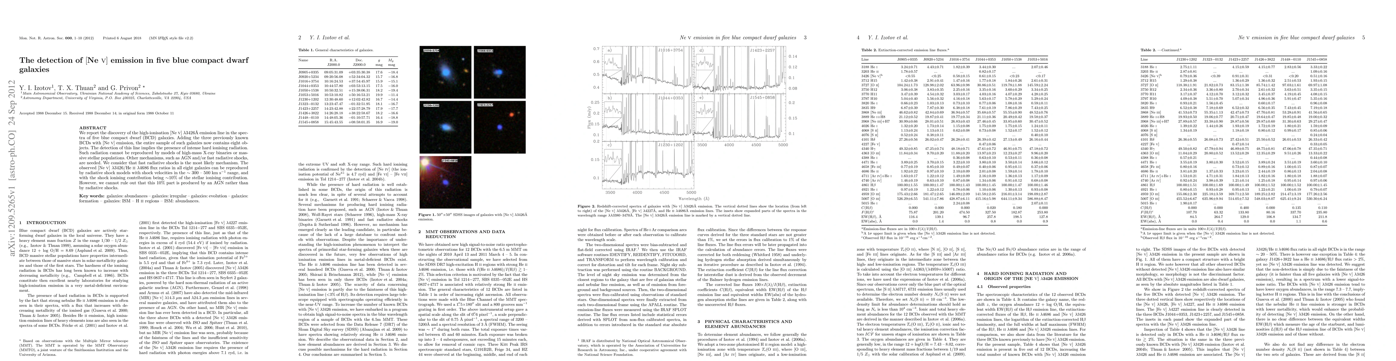 This paper reports the detection of the high-ionization [Ne v] emission line in five blue compact dwarf galaxies, suggesting intense hard ionizing radiation likely from fast radiative shocks. The findings support models where these shocks, rather than high-mass X-ray binaries or stellar populations, are the primary source of ionization.