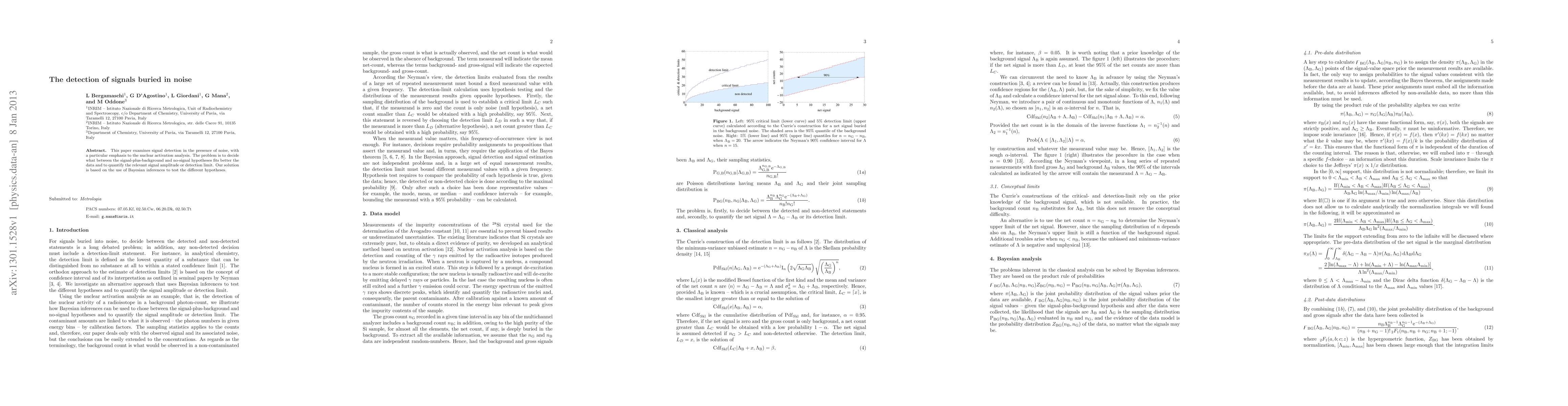 This paper examines signal detection in the presence of noise, with a particular emphasis to the nuclear activation analysis. The problem is to decide what between the signal-plus-background and no-signal hypotheses fits better the data and to quantify the relevant signal amplitude or detection limit. Our solution is based on the use of Bayesian inferences to test the different hypotheses.