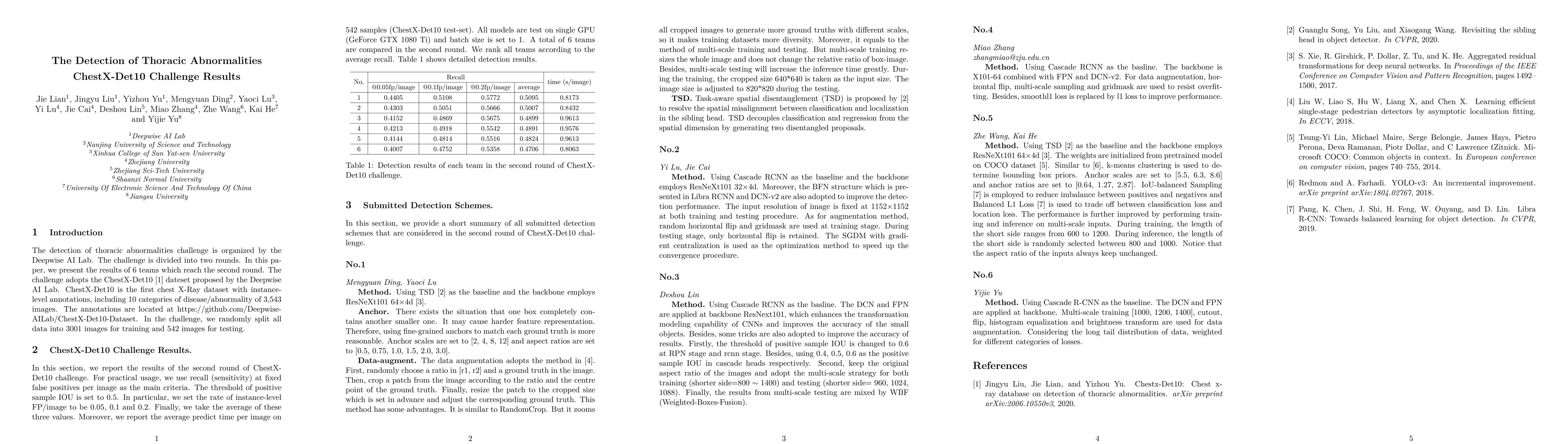 This paper reports the results of the Thoracic Abnormalities ChestX-Det10 Challenge, organized by the Deepwise AI Lab, featuring 6 teams advancing to the second round. The ChestX-Det10 dataset, with 10 categories of thoracic abnormalities across 3,543 images, was used, with data split into 3001 training and 542 testing images.