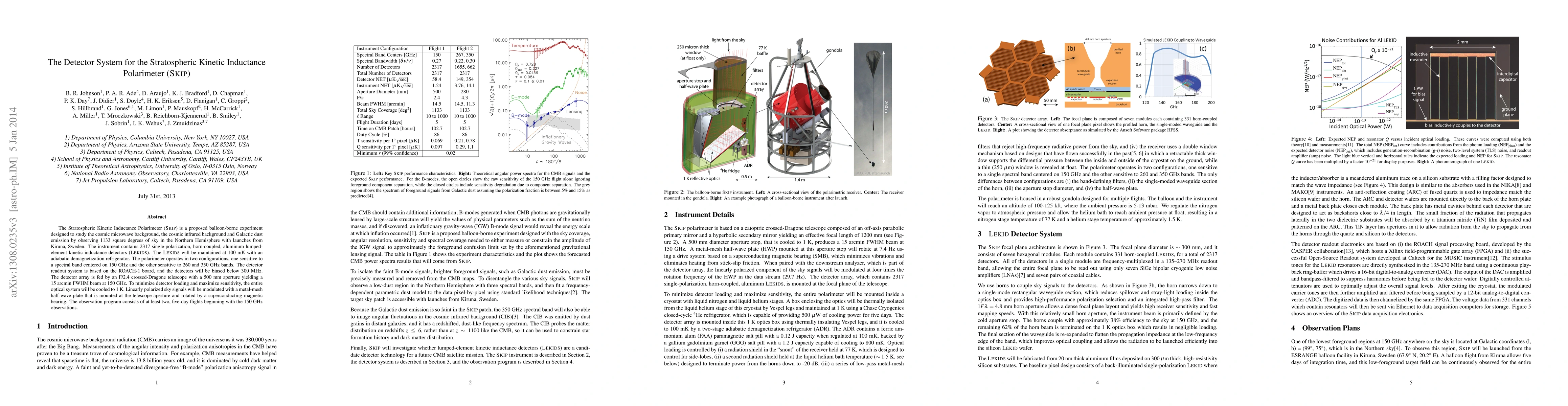 The Stratospheric Kinetic Inductance Polarimeter (SKIP) is a balloon-borne experiment designed to study cosmic microwave and infrared backgrounds using 2317 LEKIDs cooled to 100 mK. The detector readout system employs the ROACH-1 board, with a telescope cooled to 1 K to maximize sensitivity.