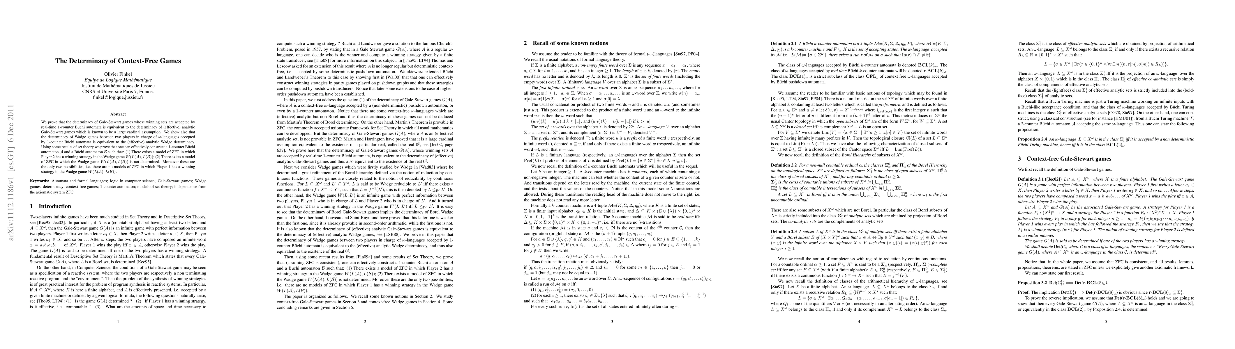 We prove that the determinacy of Gale-Stewart games whose winning sets are accepted by real-time 1-counter B\"uchi automata is equivalent to the determinacy of (effective) analytic Gale-Stewart games which is known to be a large cardinal assumption. We show also that the determinacy of Wadge games between two players in charge of omega-languages accepted by 1-counter B\"uchi automata is equivalent to the (effective) analytic Wadge determinacy. Using some results of set theory we prove that one can effectively construct a 1-counter B\"uchi automaton A and a B\"uchi automaton B such that: (1) There exists a model of ZFC in which Player 2 has a winning strategy in the Wadge game W(L(A), L(B)); (2) There exists a model of ZFC in which the Wadge game W(L(A), L(B)) is not determined. Moreover these are the only two possibilities, i.e. there are no models of ZFC in which Player 1 has a winning strategy in the Wadge game W(L(A), L(B)).