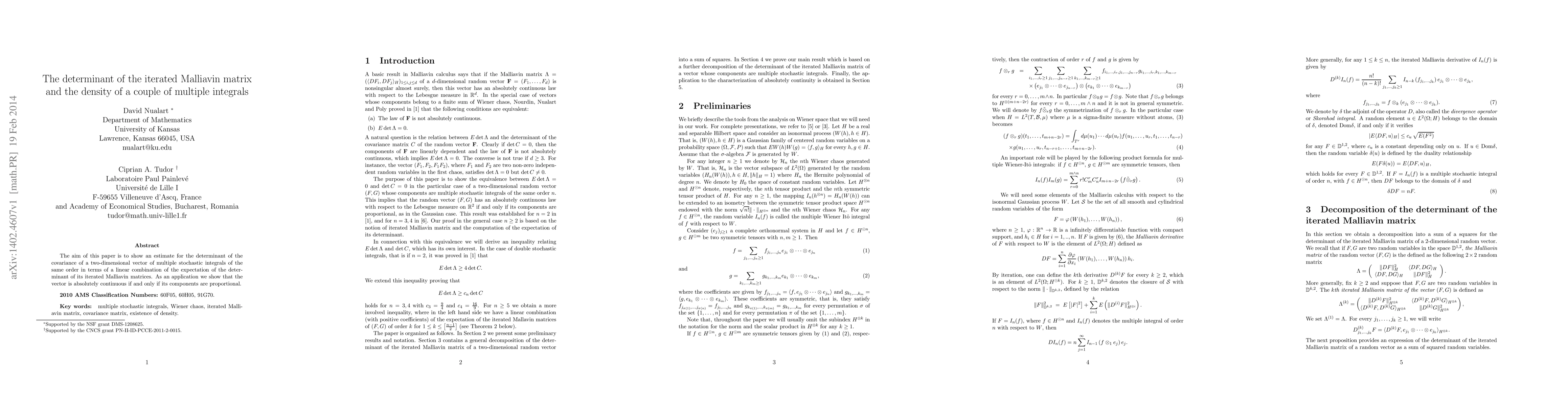 This paper estimates the determinant of the covariance of a two-dimensional vector of multiple stochastic integrals using the expectation of its iterated Malliavin matrices. It concludes that the vector is absolutely continuous if and only if its components are proportional.