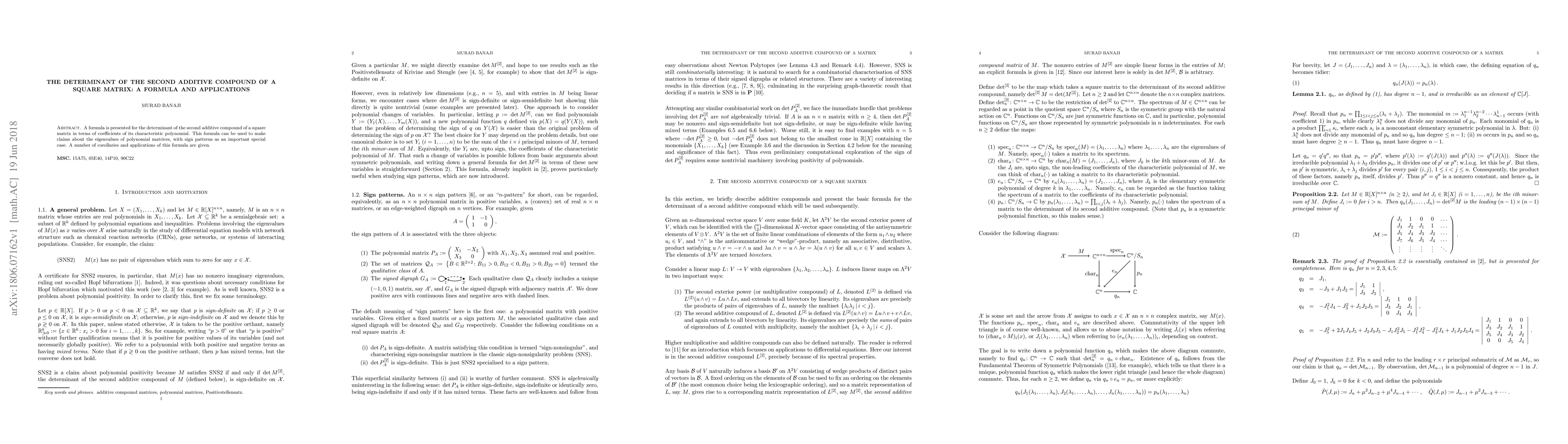 A formula is presented for the determinant of the second additive compound of a square matrix in terms of coefficients of its characteristic polynomial. This formula can be used to make claims about the eigenvalues of polynomial matrices, with sign patterns as an important special case. A number of corollaries and applications of this formula are given.