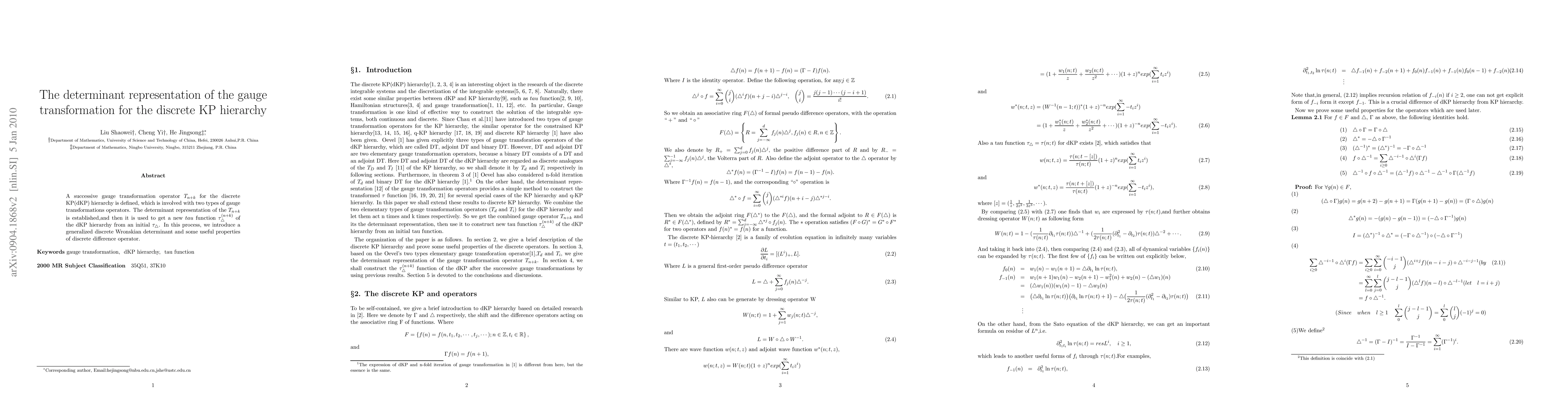 The paper defines a gauge transformation operator $T_{n+k}$ for the discrete KP hierarchy and establishes its determinant representation, utilizing a generalized discrete Wronskian determinant. This representation is used to derive a new $\tau$ function $\tau^{(n+k)}_\triangle$ from an initial $\tau_\triangle$.
