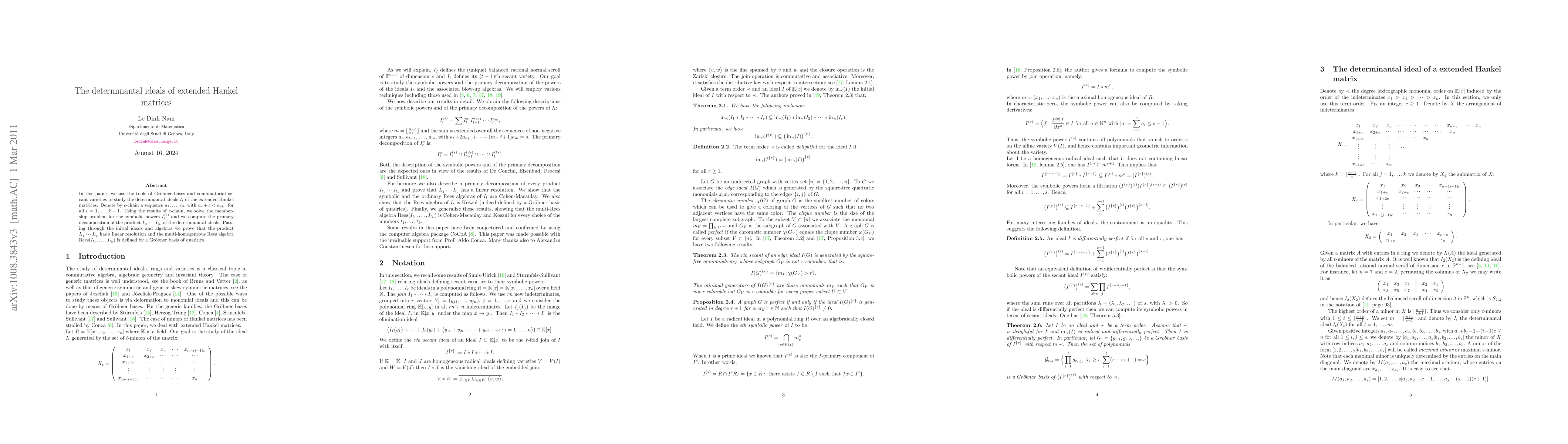 This paper investigates determinantal ideals $I_t$ of extended Hankel matrices using Gröbner bases and combinatorial secant varieties. It solves the membership problem for symbolic powers $I_t^{(s)}$ and computes the primary decomposition of products of these ideals, proving a linear resolution and defining the multi-homogeneous Rees algebra via a Gröbner basis of quadrics.