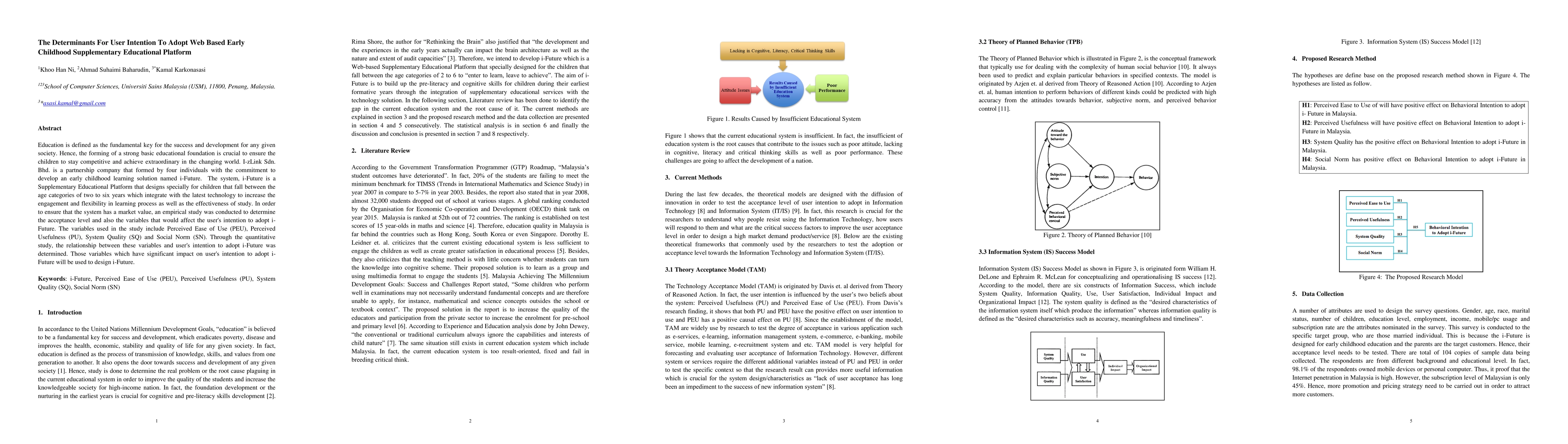 Education is defined as the fundamental key for the success and development for any given society. Hence, the forming of a strong basic educational foundation is crucial to ensure the children to stay competitive and achieve extraordinary in the changing world. I-zLink Sdn. Bhd. is a partnership company that formed by four individuals with the commitment to develop an early childhood learning solution named i-Future. The system, i-Future is a Supplementary Educational Platform that designs specially for children that fall between the age categories of two to six years which integrate with the latest technology to increase the engagement and flexibility in learning process as well as the effectiveness of study. In order to ensure that the system has a market value, an empirical study was conducted to determine the acceptance level and also the variables that would affect the user's intention to adopt i-Future. The variables used in the study include Perceived Ease of Use (PEU), Perceived Usefulness (PU), System Quality (SQ) and Social Norm (SN). Through the quantitative study, the relationship between these variables and user's intention to adopt i-Future was determined. Those variables which have significant impact on user's intention to adopt i-Future will be used to design i-Future.