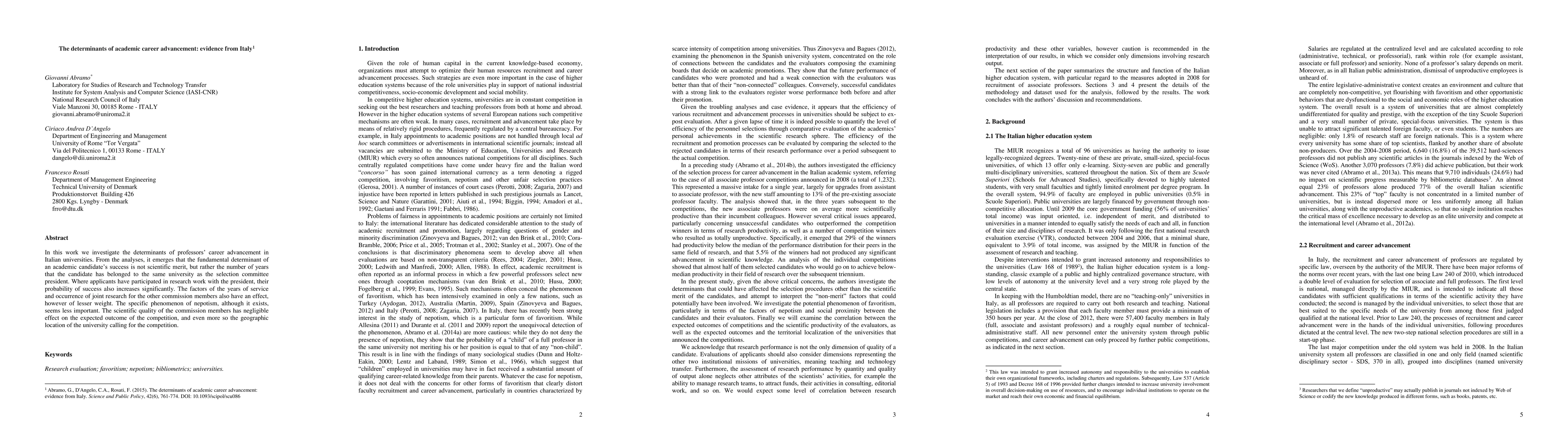 In this work we investigate the determinants of professors' career advancement in Italian universities. From the analyses, it emerges that the fundamental determinant of an academic candidate's success is not scientific merit, but rather the number of years that the candidate has belonged to the same university as the selection committee president. Where applicants have participated in research work with the president, their probability of success also increases significantly. The factors of the years of service and occurrence of joint research for the other commission members also have an effect, however of lesser weight. The specific phenomenon of nepotism, although it exists, seems less important. The scientific quality of the commission members has negligible effect on the expected outcome of the competition, and even more so the geographic location of the university calling for the competition.