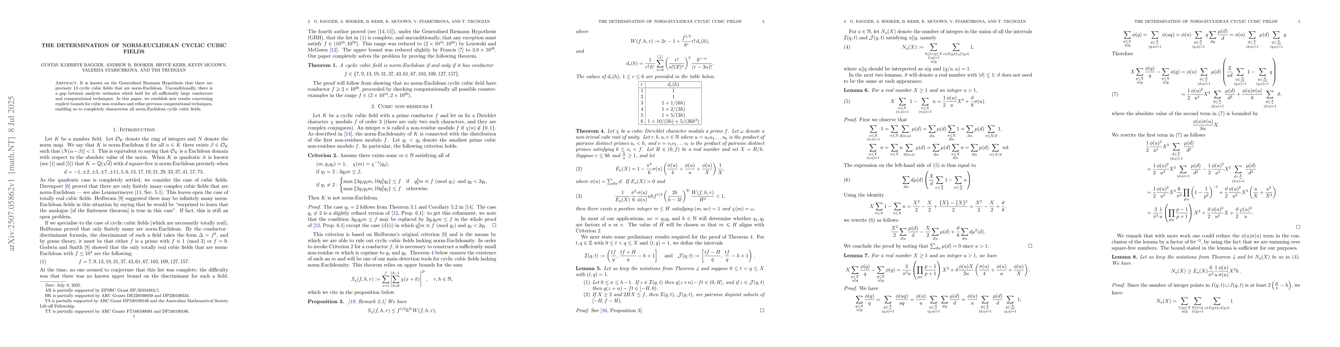 It is known on the Generalised Riemann Hypothesis that there are precisely $13$ cyclic cubic fields that are norm-Euclidean. Unconditionally, there is a gap between analytic estimates which hold for all sufficiently large conductors and computational techniques. In this paper, we establish new results concerning explicit bounds for cubic non-residues and refine previous computational techniques, enabling us to completely characterise all norm-Euclidean cyclic cubic fields.