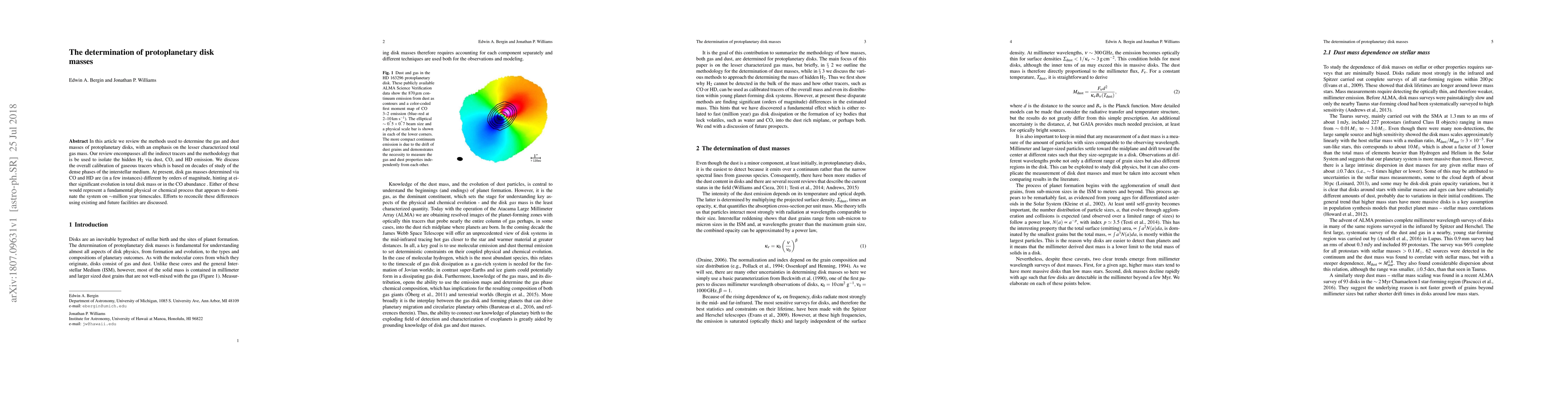 The paper reviews methods used to determine gas and dust masses of protoplanetary disks, focusing on total gas mass determination through indirect tracers like dust, CO, and HD emission. It discusses the calibration of gaseous tracers based on interstellar medium studies.