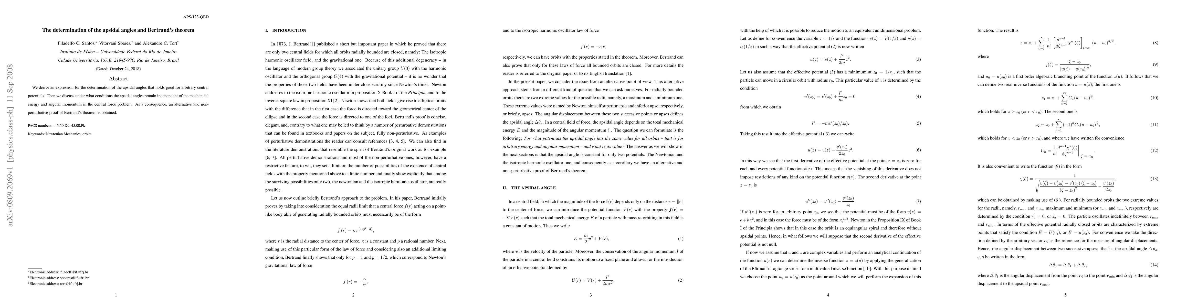 This paper derives an expression for apsidal angles in arbitrary central potentials and explores conditions under which these angles are independent of energy and angular momentum, leading to a non-perturbative proof of Bertrand's theorem.