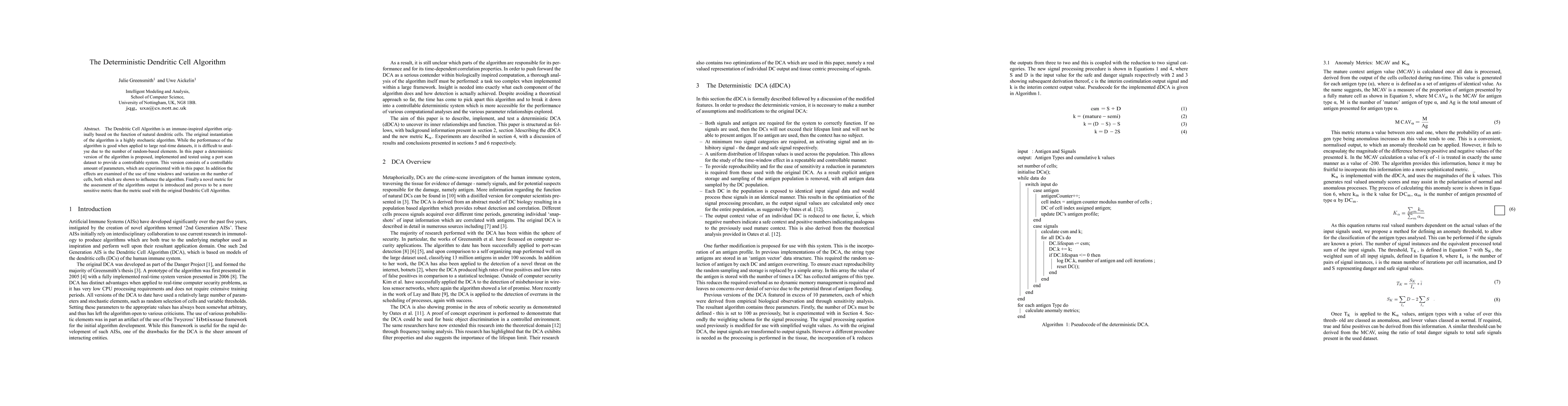 This paper proposes a deterministic version of the immune-inspired Dendritic Cell Algorithm, originally stochastic, to enhance analyzability. The new version is tested on a port scan dataset, demonstrating controllable parameters and the influence of time windows and cell number variations, with a novel, more sensitive metric introduced for assessment.