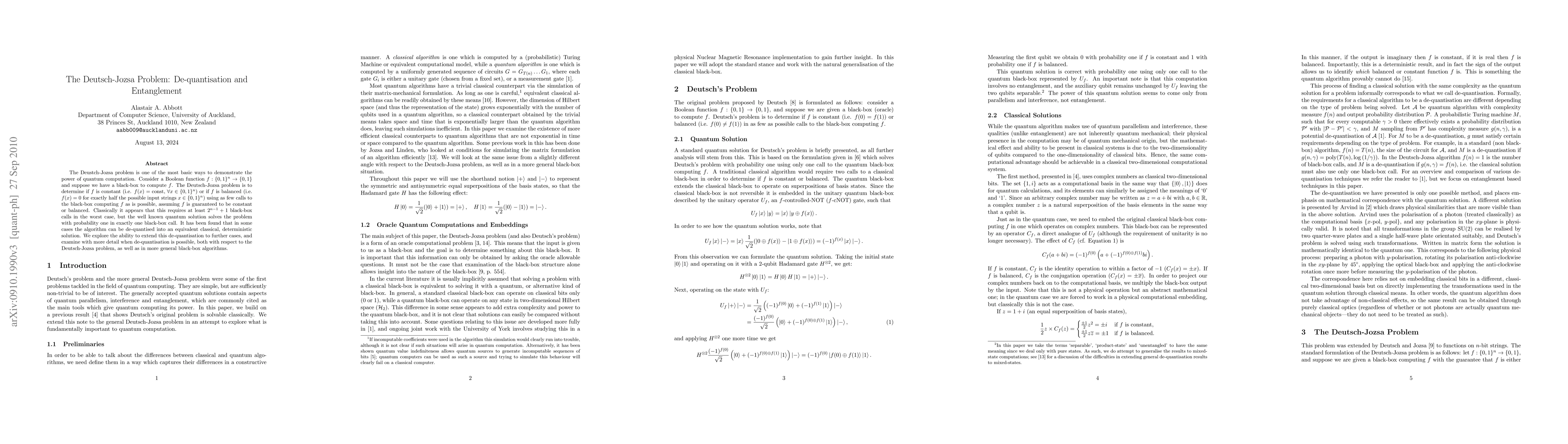 This paper investigates the de-quantisation of the Deutsch-Jozsa problem, exploring whether the quantum algorithm's efficiency can be replicated in classical deterministic terms, and examines the conditions under which such a transition is feasible.