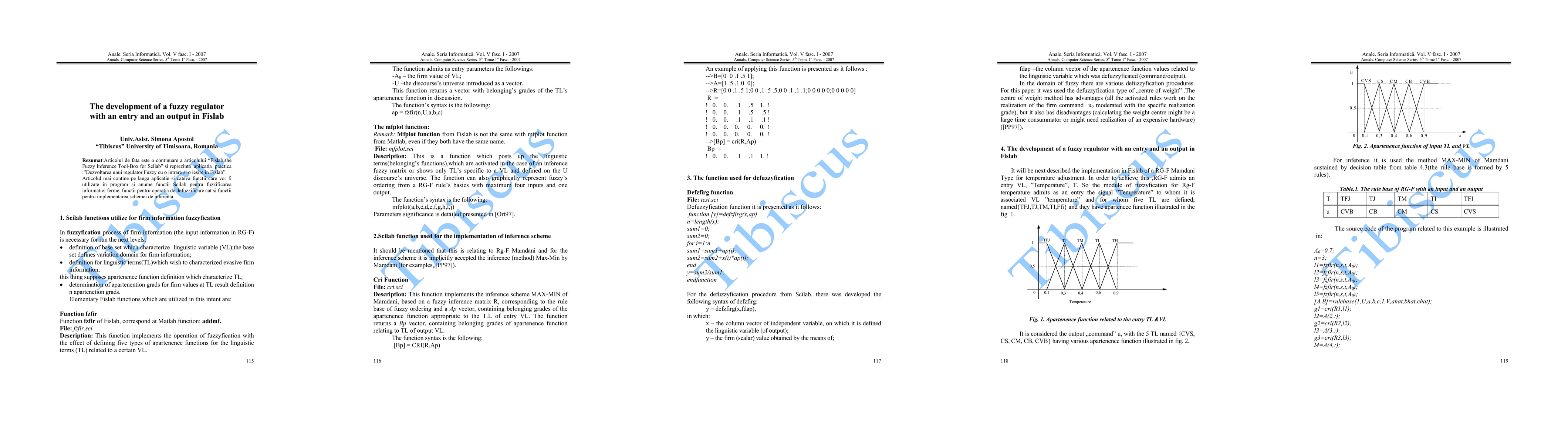 The present article is a sequel of the article "Fislab the Fuzzy Inference Tool-Box for Scilab" and it represents the practical application of:"The development of the Fuzzy regulator with an input and an output in Fislab". The article contains, besides this application, some functions to be used in the program, namely Scilab functions for the fuzzification of the firm information, functions for the operation of de-fuzzification and functions for the implementation of.