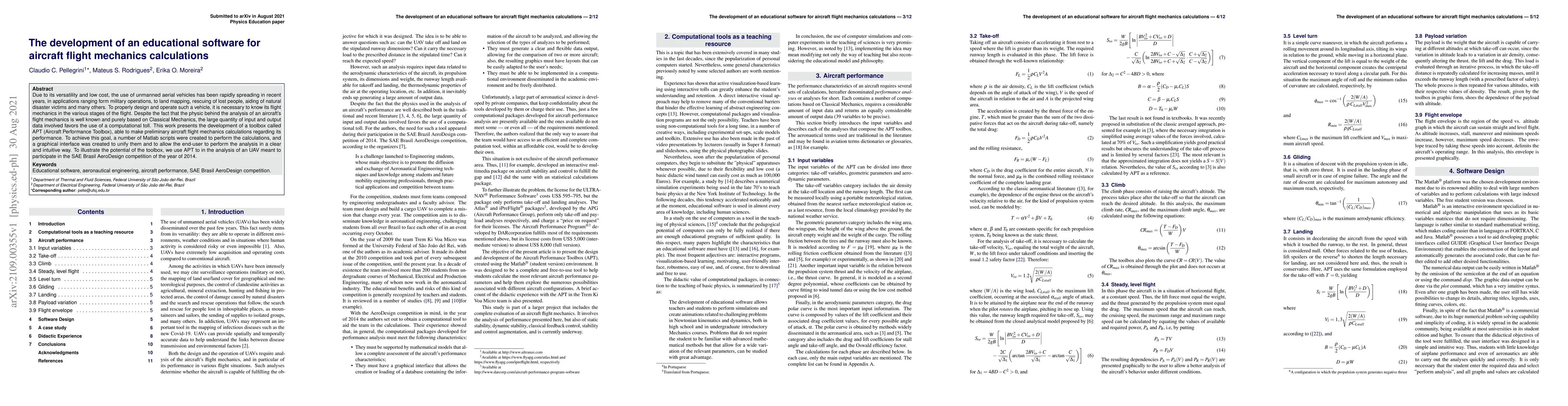 Due to its versatility and low cost, the use of unmanned aerial vehicles has been rapidly spreading in recent years, in applications ranging form military operations, to land mapping, rescuing of lost people, aiding of natural disaster victims and many others. To properly design and operate such a vehicle, it is necessary to know its flight mechanics in the various stages of the flight. Despite the fact that the physic behind the analysis of an aircraft's flight mechanics is well known and purely based on Classical Mechanics, the large quantity of input and output data involved favors the use of a computational toll. This work presents the development of a toolbox called APT (Aircraft Performance Toolbox), able to make preliminary aircraft flight mechanics calculations regarding its performance. To achieve this goal, a number of Matlab scripts were created to perform the calculations, and a graphical interface was created to unify them and to allow the end-user to perform the analysis in a clear and intuitive way. To illustrate the potential of the toolbox, we use APT to in the analysis of an UAV meant to participate in the SAE Brasil AeroDesign competition of the year of 2014.