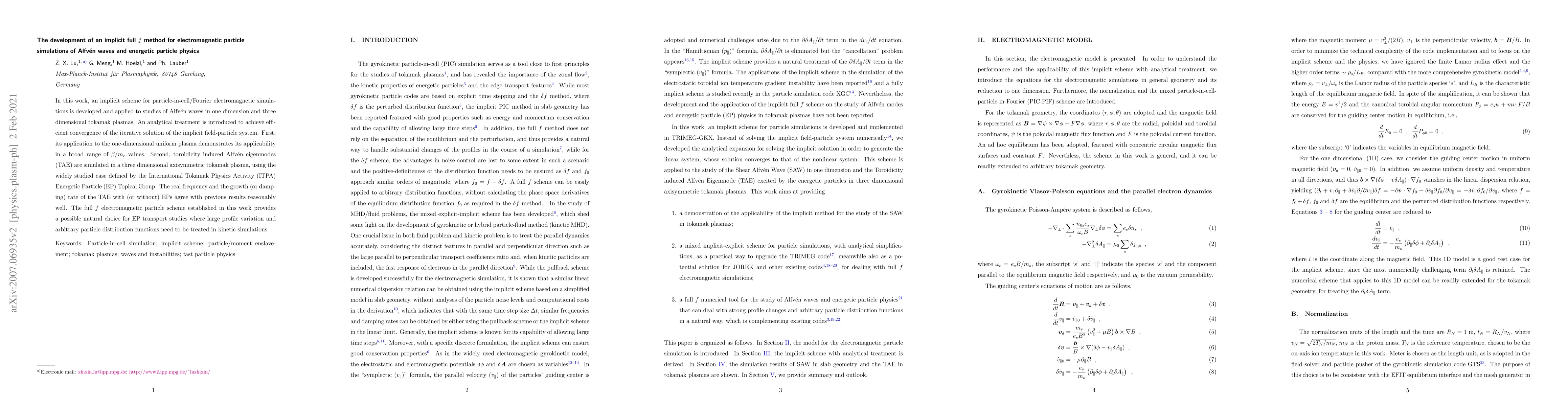 An implicit full f method has been developed for electromagnetic particle simulations of Alfvén waves and energetic particle physics, utilizing an analytical treatment for efficient convergence of the iterative solution of the implicit field-particle system.