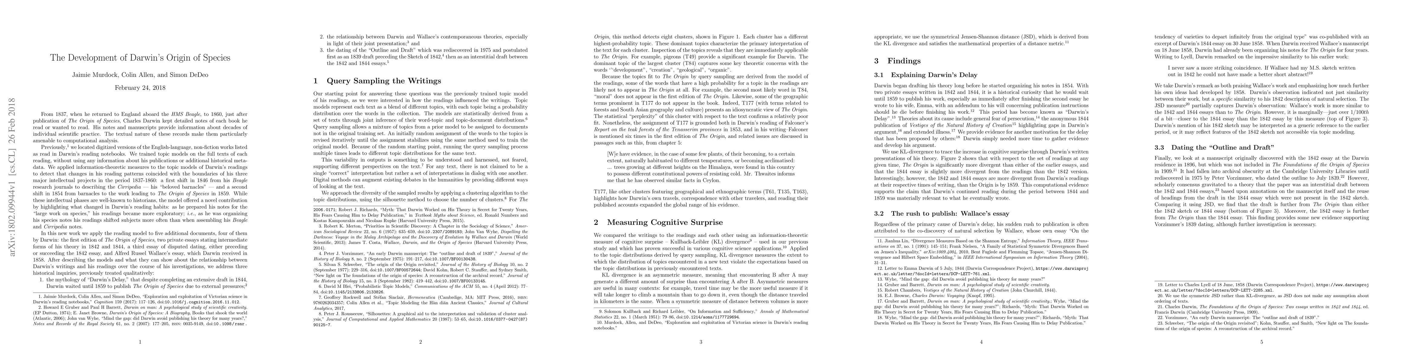 From 1837, when he returned to England aboard the $\textit{HMS Beagle}$, to 1860, just after publication of $\textit{The Origin of Species}$, Charles Darwin kept detailed notes of each book he read or wanted to read. His notes and manuscripts provide information about decades of individual scientific practice. Previously, we trained topic models on the full texts of each reading, and applied information-theoretic measures to detect that changes in his reading patterns coincided with the boundaries of his three major intellectual projects in the period 1837-1860. In this new work we apply the reading model to five additional documents, four of them by Darwin: the first edition of $\textit{The Origin of Species}$, two private essays stating intermediate forms of his theory in 1842 and 1844, a third essay of disputed dating, and Alfred Russel Wallace's essay, which Darwin received in 1858. We address three historical inquiries, previously treated qualitatively: 1) the mythology of "Darwin's Delay," that despite completing an extensive draft in 1844, Darwin waited until 1859 to publish $\textit{The Origin of Species}$ due to external pressures; 2) the relationship between Darwin and Wallace's contemporaneous theories, especially in light of their joint presentation; and 3) dating of the "Outline and Draft" which was rediscovered in 1975 and postulated first as an 1839 draft preceding the Sketch of 1842, then as an interstitial draft between the 1842 and 1844 essays.