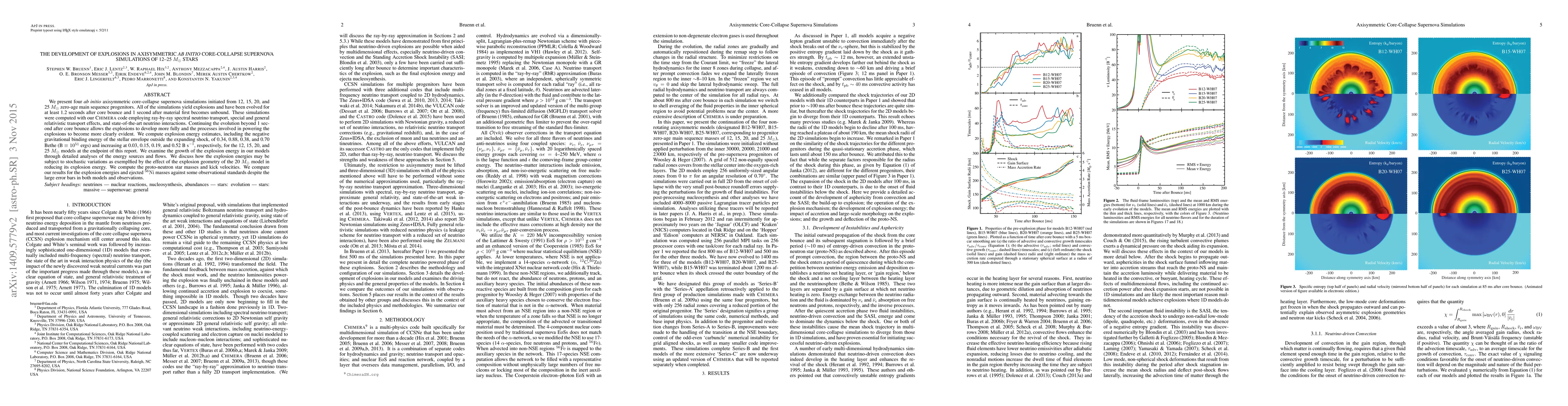 This paper presents four axisymmetric core-collapse supernova simulations for 12-25 $M_\odot$ stars, all yielding explosions. The 12, 15, 20, and 25 $M_\odot$ models show explosion energies of 0.34, 0.88, 0.38, and 0.70 B ($10^{51}$ ergs), respectively, with increasing rates, and the 20 $M_\odot$ model exhibits a unique off-center shock morphology that reduces its explosion energy.