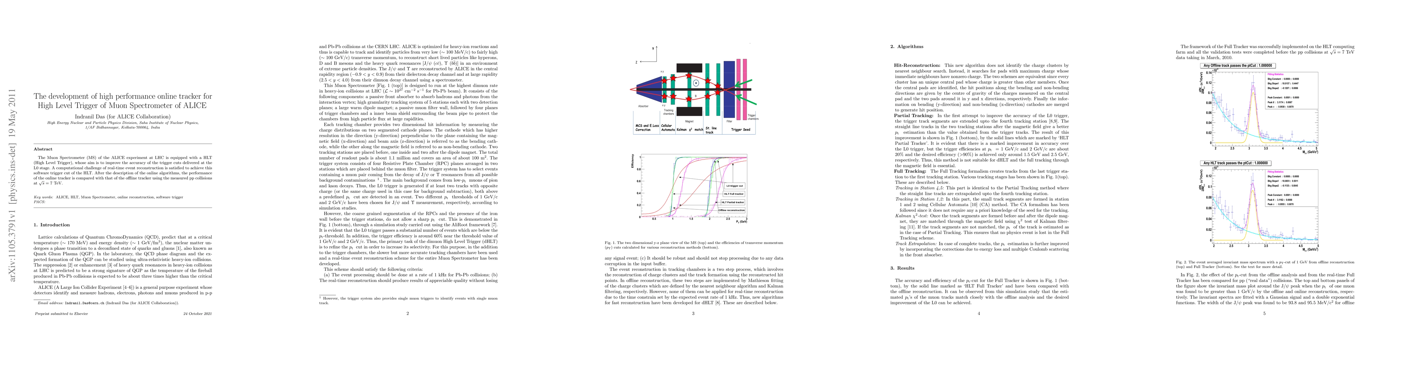 The Muon Spectrometer (MS) of the ALICE experiment at LHC is equipped with a HLT (High Level Trigger), whose aim is to improve the accuracy of the trigger cuts delivered at the L0 stage. A computational challenge of real-time event reconstruction is satisfied to achieve this software trigger cut of the HLT. After the description of the online algorithms, the performance of the online tracker is compared with that of the offline tracker using the measured pp collisions at $\sqrt{s}=7$ TeV.