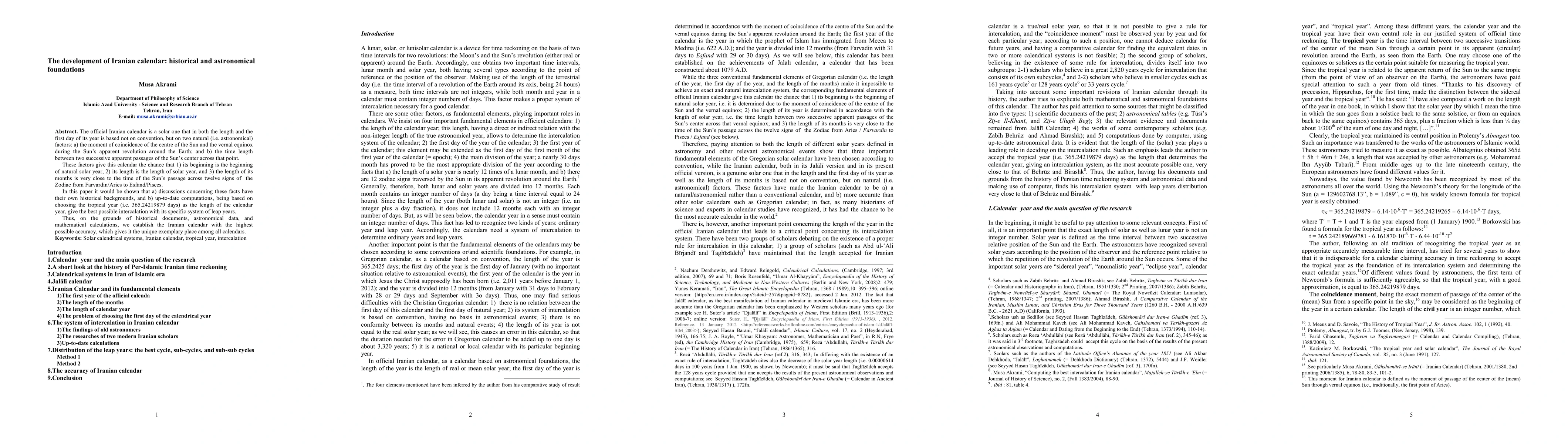 The official Iranian calendar is a solar one that in both the length and the first day of its year is based not on convention, but on two natural (i.e. astronomical) factors: a) the moment of coincidence of the centre of the Sun and the vernal equinox during the Sun's apparent revolution around the Earth; and b) the time length between two successive apparent passages of the Sun's center across that point. These factors give this calendar the chance that 1) its beginning is the beginning of natural solar year, 2) its length is the length of solar year, and 3) the length of its months is very close to the time of the Sun's passage across twelve signs of the Zodiac from Farvardin/Aries to Esfand/Pisces. In this paper it would be shown that a) discussions concerning these facts have their own historical backgrounds, and b) up-to-date computations, being based on choosing the tropical year (i.e. 365.24219879 days) as the length of the calendar year, give the best possible intercalation with its specific system of leap years. Thus, on the grounds of historical documents, astronomical data, and mathematical calculations, we establish the Iranian calendar with the highest possible accuracy, which gives it the unique exemplary place among all calendars.