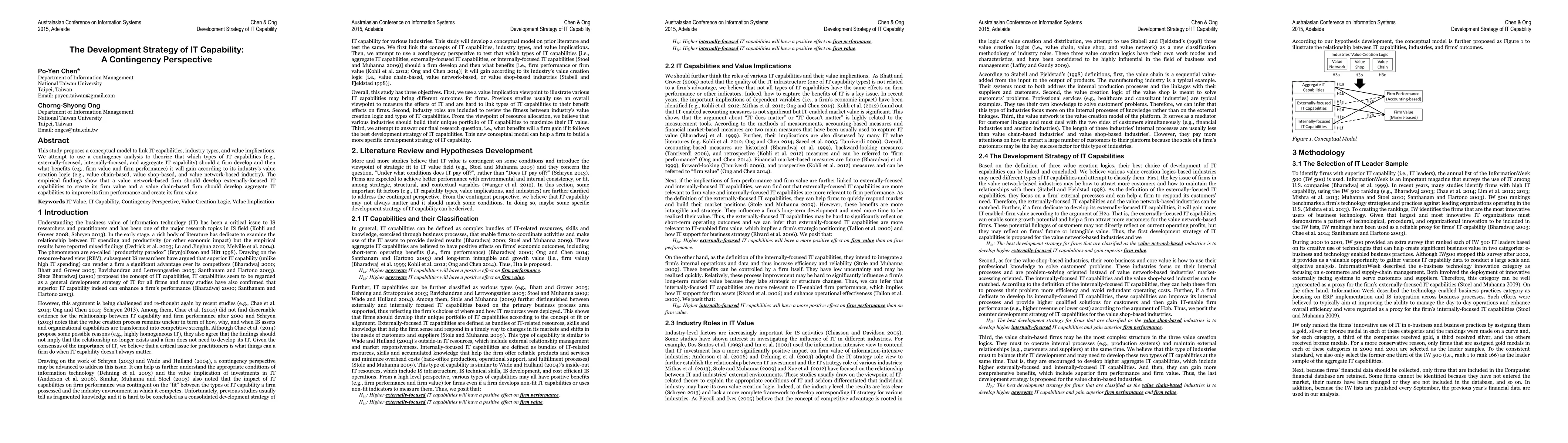 This study proposes a model linking IT capabilities to industry types and firm benefits, suggesting firms in value network-based industries should develop externally-focused IT capabilities for firm value, while value chain-based firms should develop aggregate IT capabilities to enhance performance and value.