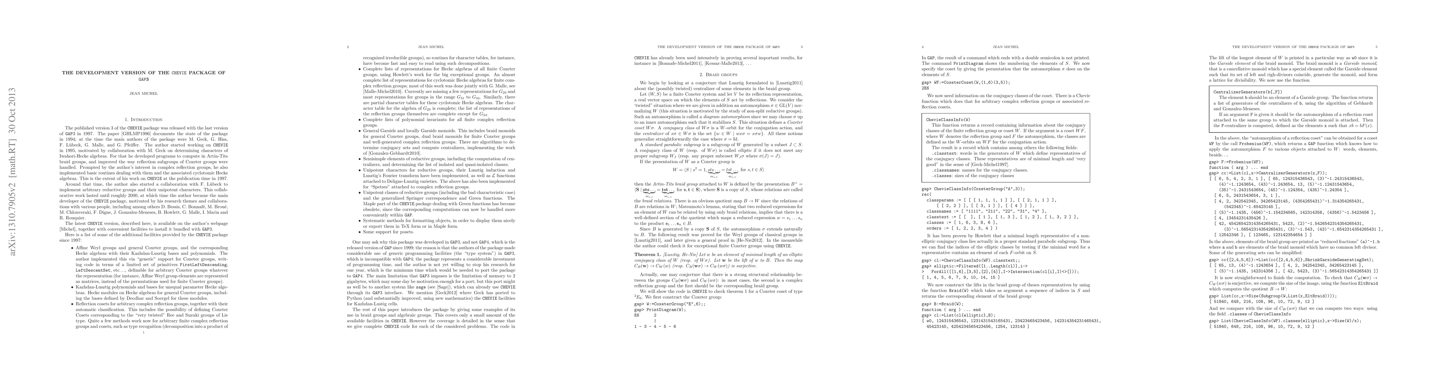 I describe the current state of the development version of the CHEVIE package, which deals with Coxeter groups, reductive algebraic groups, complex reflection groups, Hecke algebras, braid monoids, etc... Examples are given, showing the code to check some results of Lusztig.