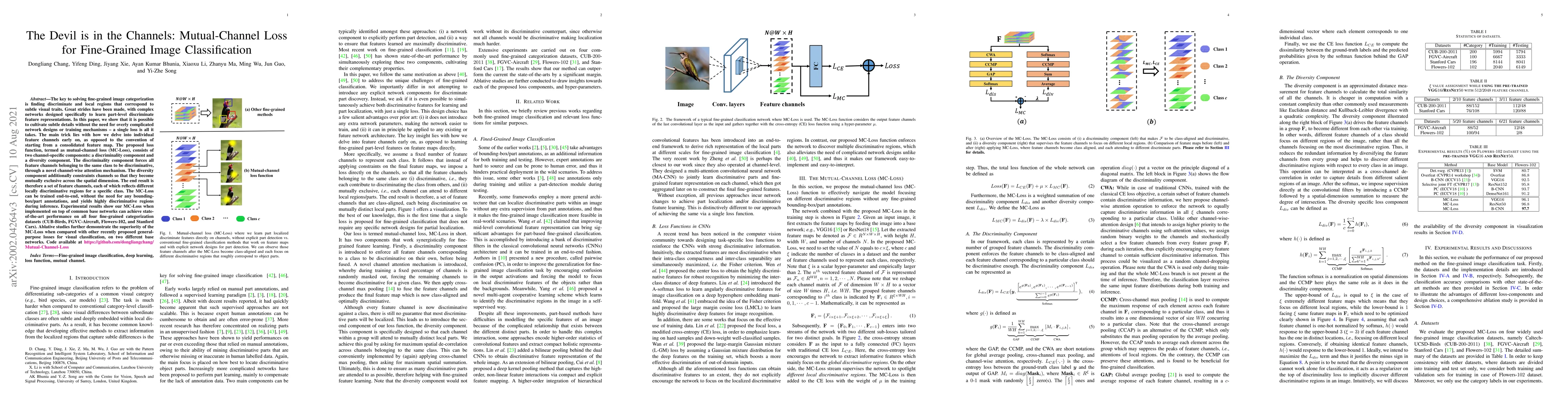 This paper proposes a mutual-channel loss (MC-Loss) to enhance fine-grained image classification by focusing on discriminative and diverse feature channels without complex network designs. The MC-Loss includes a discriminality component and a diversity component, achieving state-of-the-art results on four fine-grained datasets.