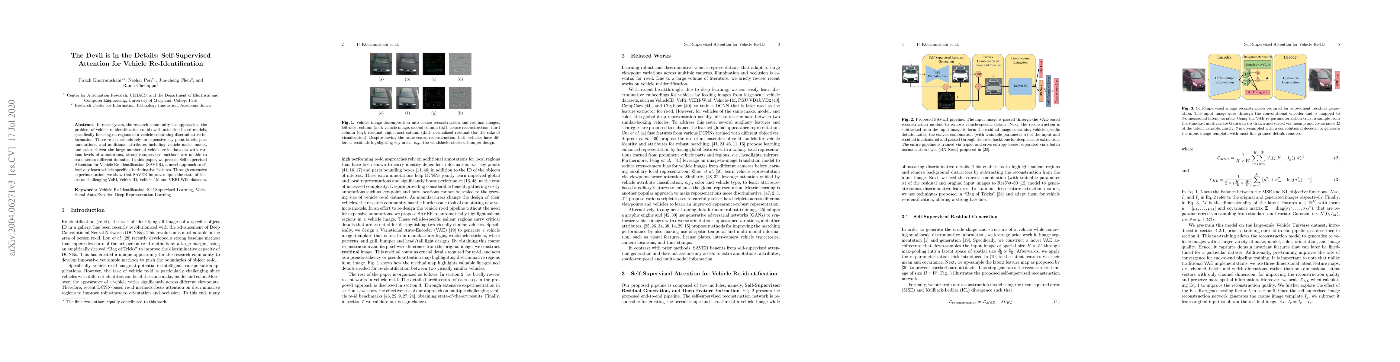 This paper introduces SAVER, a self-supervised attention method for vehicle re-identification that learns discriminative features without relying on expensive annotations. SAVER outperforms existing state-of-the-art methods on multiple datasets, demonstrating its scalability across different domains.