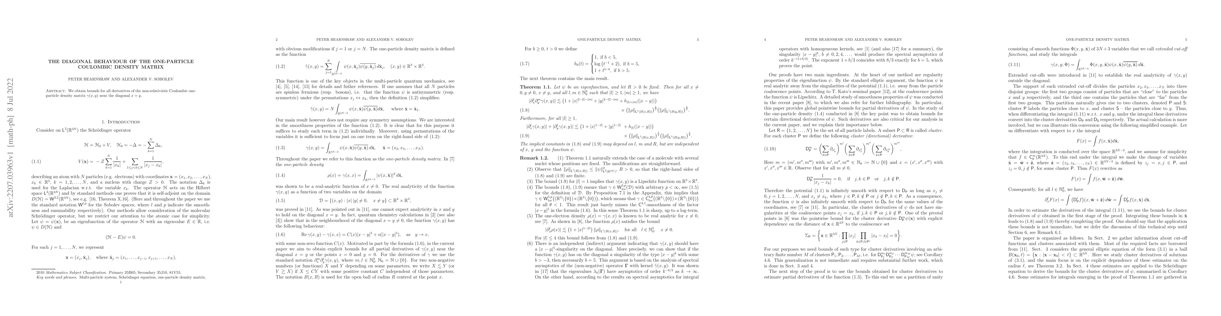 Summary: This paper establishes bounds for the derivatives of the non-relativistic Coulombic one-particle density matrix $\gamma(x, y)$ near the diagonal $x = y$, focusing on the diagonal behavior. The results provide insights into the mathematical properties of Coulombic interactions in quantum systems.