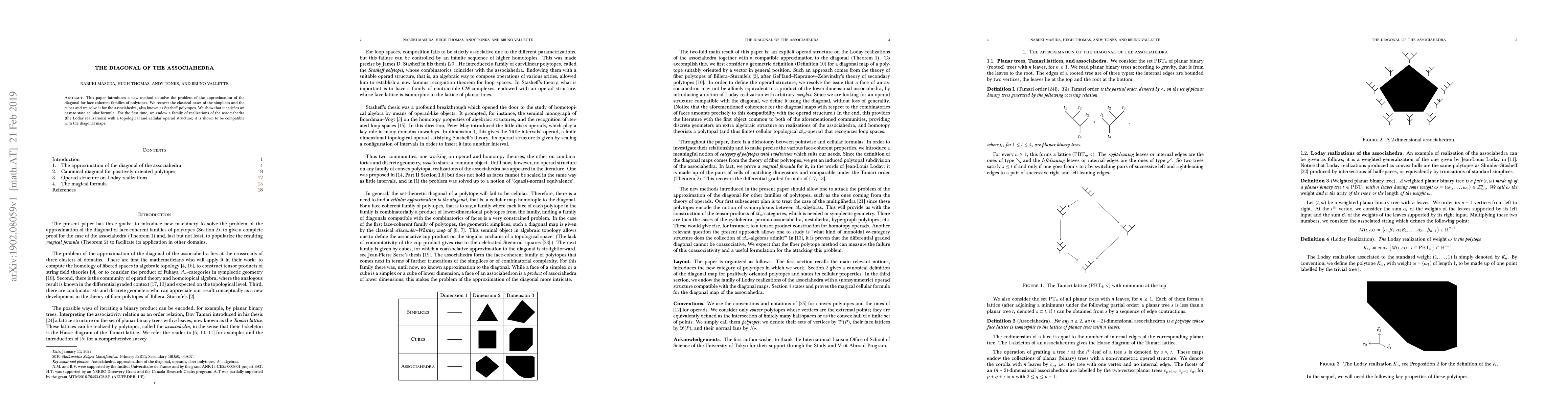 This paper presents a novel method for approximating the diagonal of associahedra, extending the approach to classical simplices and cubes, and introducing a cellular formula. It also endows Loday realizations of associahedra with a topological and cellular operad structure compatible with diagonal maps.