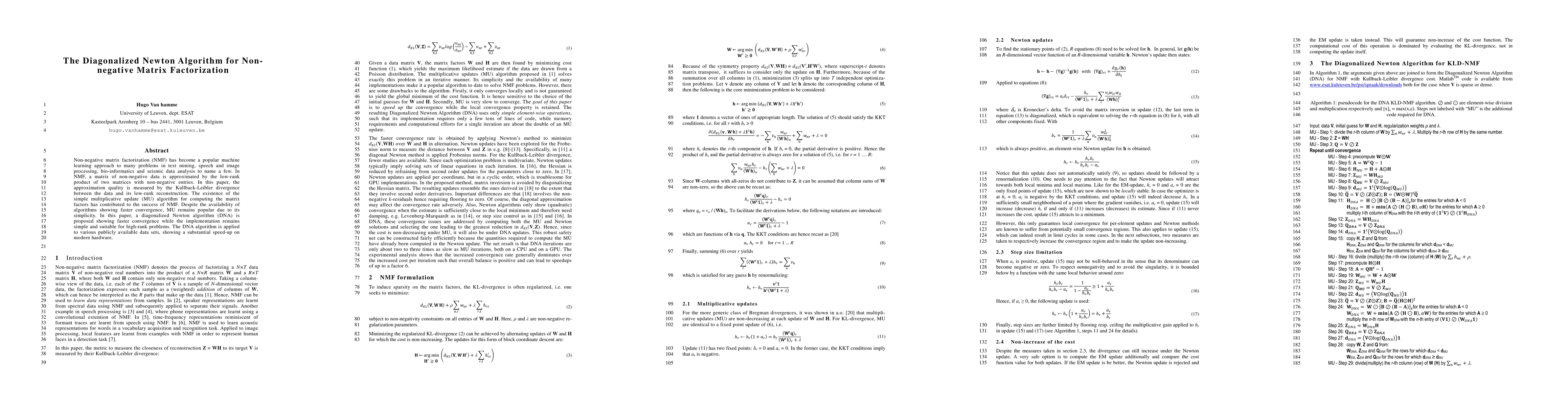 Non-negative matrix factorization (NMF) has become a popular machine learning approach to many problems in text mining, speech and image processing, bio-informatics and seismic data analysis to name a few. In NMF, a matrix of non-negative data is approximated by the low-rank product of two matrices with non-negative entries. In this paper, the approximation quality is measured by the Kullback-Leibler divergence between the data and its low-rank reconstruction. The existence of the simple multiplicative update (MU) algorithm for computing the matrix factors has contributed to the success of NMF. Despite the availability of algorithms showing faster convergence, MU remains popular due to its simplicity. In this paper, a diagonalized Newton algorithm (DNA) is proposed showing faster convergence while the implementation remains simple and suitable for high-rank problems. The DNA algorithm is applied to various publicly available data sets, showing a substantial speed-up on modern hardware.