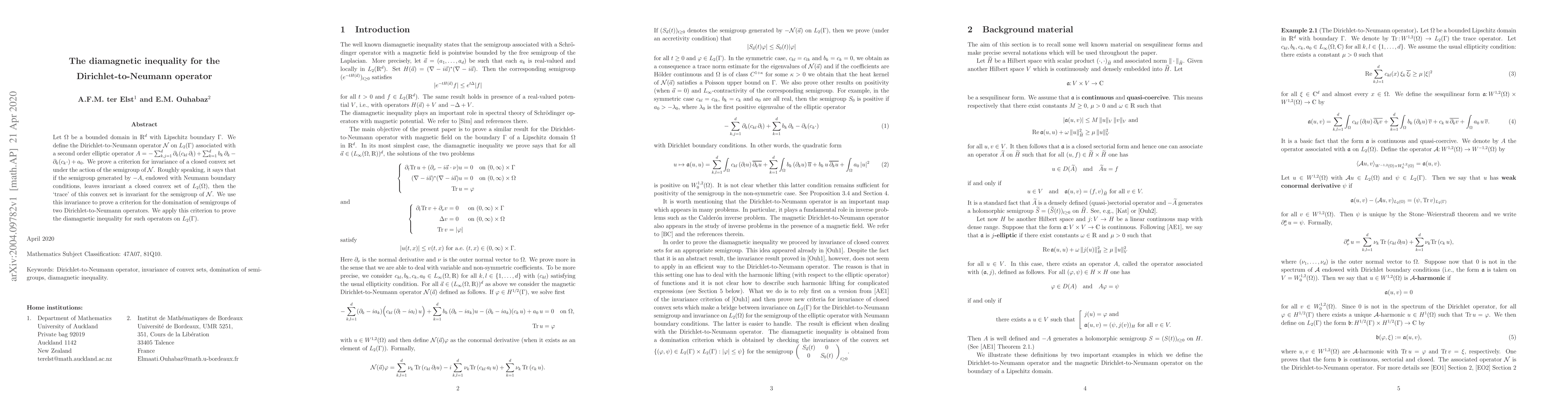 Let $\Omega$ be a bounded domain in R d with Lipschitz boundary $\Gamma$. We define the Dirichlet-to-Neumann operator N on L 2 ($\Gamma$) associated with a second order elliptic operator A = -- d k,j=1 $\partial$ k (c kl $\partial$ l) + d k=1 b k $\partial$ k -- $\partial$ k (c k $\times$) + a 0. We prove a criterion for invariance of a closed convex set under the action of the semigroup of N. Roughly speaking, it says that if the semigroup generated by --A, endowed with Neumann boundary conditions, leaves invariant a closed convex set of L 2 ($\Omega$), then the 'trace' of this convex set is invariant for the semigroup of N. We use this invariance to prove a criterion for the domination of semigroups of two Dirichlet-to-Neumann operators. We apply this criterion to prove the diamagnetic inequality for such operators on L 2 ($\Gamma$).