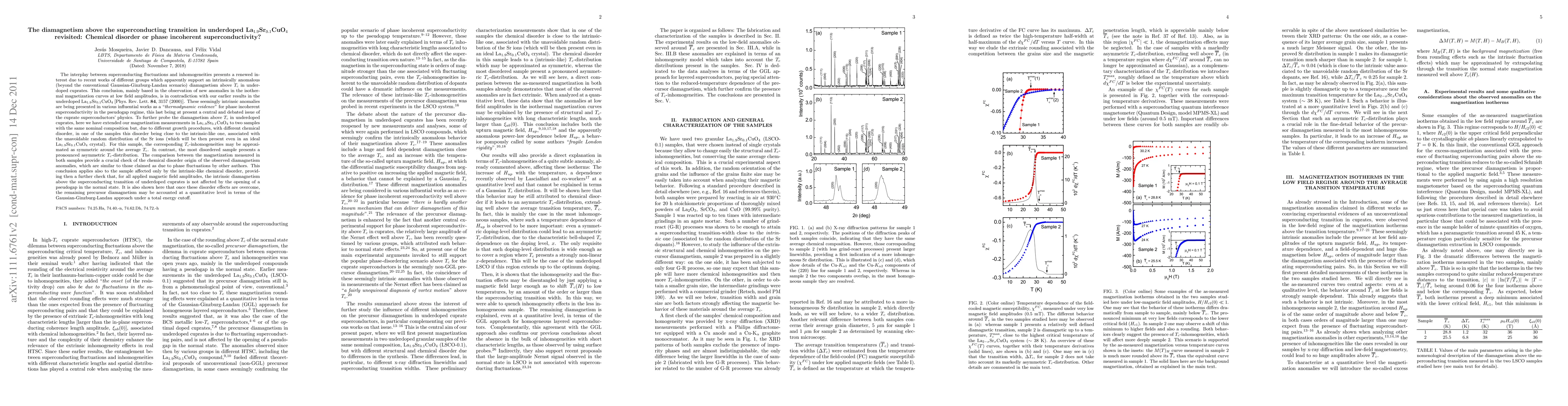 This paper revisits the diamagnetism anomalies above Tc in underdoped La(1.9)Sr(0.1)CuO(4), comparing samples with different levels of chemical disorder to determine if these anomalies are due to intrinsic phase incoherent superconductivity or chemical disorder. The results suggest that the observed diamagnetism can be explained by chemical disorder rather than phase incoherent superconductivity.