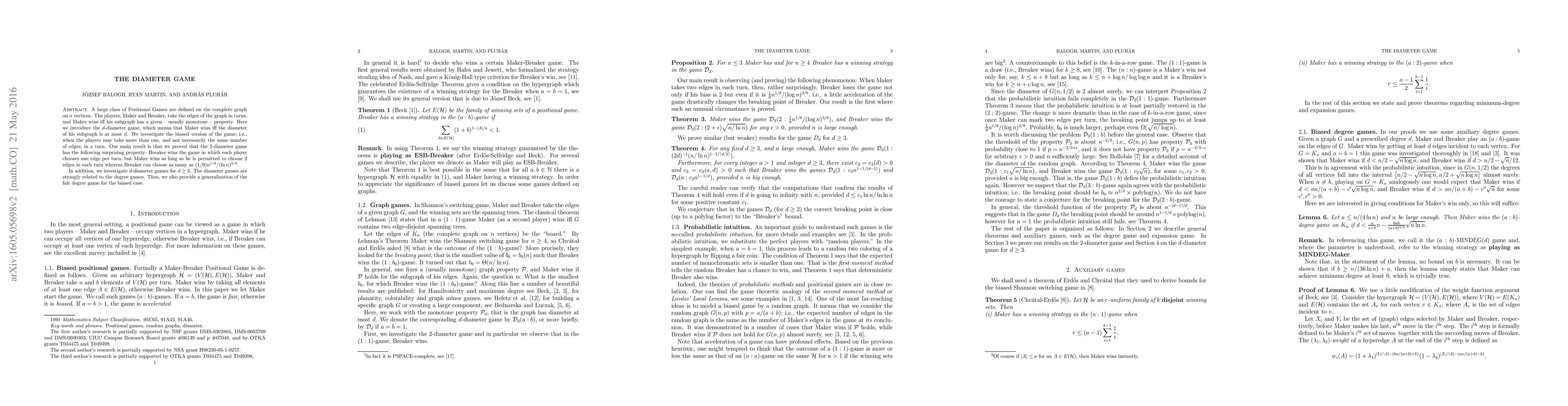 A large class of Positional Games are defined on the complete graph on $n$ vertices. The players, Maker and Breaker, take the edges of the graph in turns, and Maker wins iff his subgraph has a given -- usually monotone -- property. Here we introduce the $d$-diameter game, which means that Maker wins iff the diameter of his subgraph is at most $d$. We investigate the biased version of the game; i.e., when the players may take more than one, and not necessarily the same number of edges, in a turn. Our main result is that we proved that the $2$-diameter game has the following surprising property: Breaker wins the game in which each player chooses one edge per turn, but Maker wins as long as he is permitted to choose $2$ edges in each turn whereas Breaker can choose as many as $(1/9)n^{1/8}/(\ln n)^{3/8}$. In addition, we investigate $d$-diameter games for $d\ge 3$. The diameter games are strongly related to the degree games. Thus, we also provide a generalization of the fair degree game for the biased case.