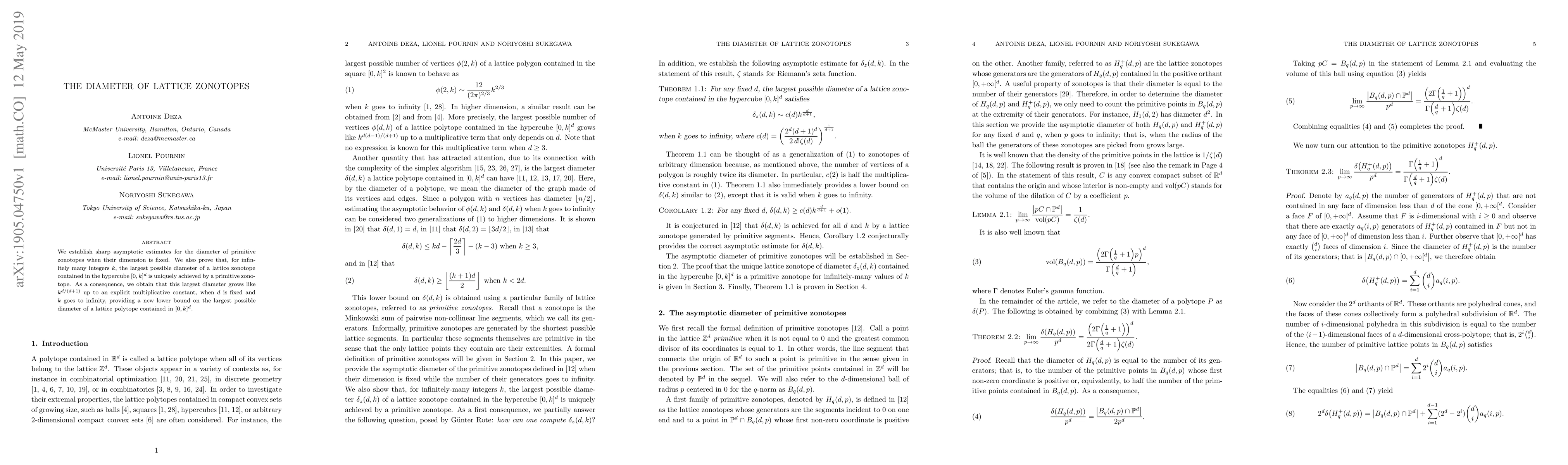 The paper presents novel methods for estimating the diameter of lattice zonotopes and proves unique achievement of the largest diameter by primitive zonotopes for infinitely many $k$ values.