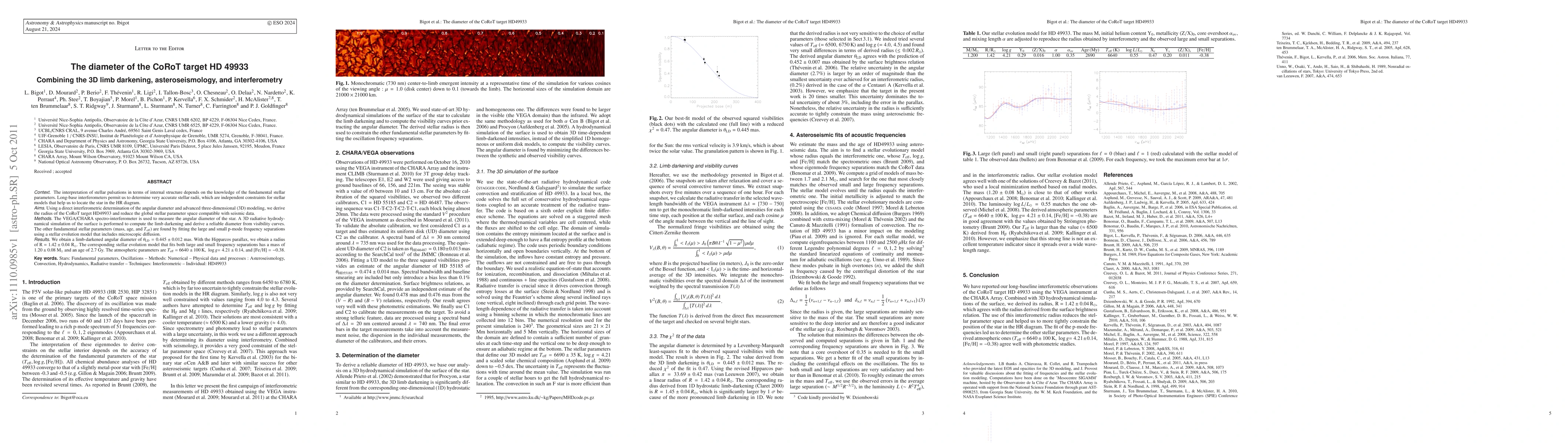 Context. The interpretation of stellar pulsations in terms of internal structure depends on the knowledge of the fundamental stellar parameters. Long-base interferometers permit us to determine very accurate stellar radii, which are independent constraints for stellar models that help us to locate the star in the HR diagram. Aims: Using a direct interferometric determination of the angular diameter and advanced three-dimensional (3D) modeling, we derive the radius of the CoRoT target HD 49933 and reduce the global stellar parameter space compatible with seismic data. Methods: The VEGA/CHARA spectro-interferometer is used to measure the angular diameter of the star. A 3D radiative hydrodynamical simulation of the surface is performed to compute the limb darkening and derive a reliable diameter from visibility curves. The other fundamental stellar parameters (mass, age, and Teff) are found by fitting the large and small p-mode frequency separations using a stellar evolution model that includes microscopic diffusion. Results: We obtain a limb-darkened angular diameter of {\theta}LD = 0.445 \pm 0.012 mas. With the Hipparcos parallax, we obtain a radius of R = 1.42 \pm 0.04 Rsun. The corresponding stellar evolution model that fits both large and small frequency separations has a mass of 1.20 \pm 0.08 Msun and an age of 2.7 Gy. The atmospheric parameters are Teff = 6640 \pm 100 K, log g = 4.21 \pm 0.14, and [Fe/H] = -0.38.