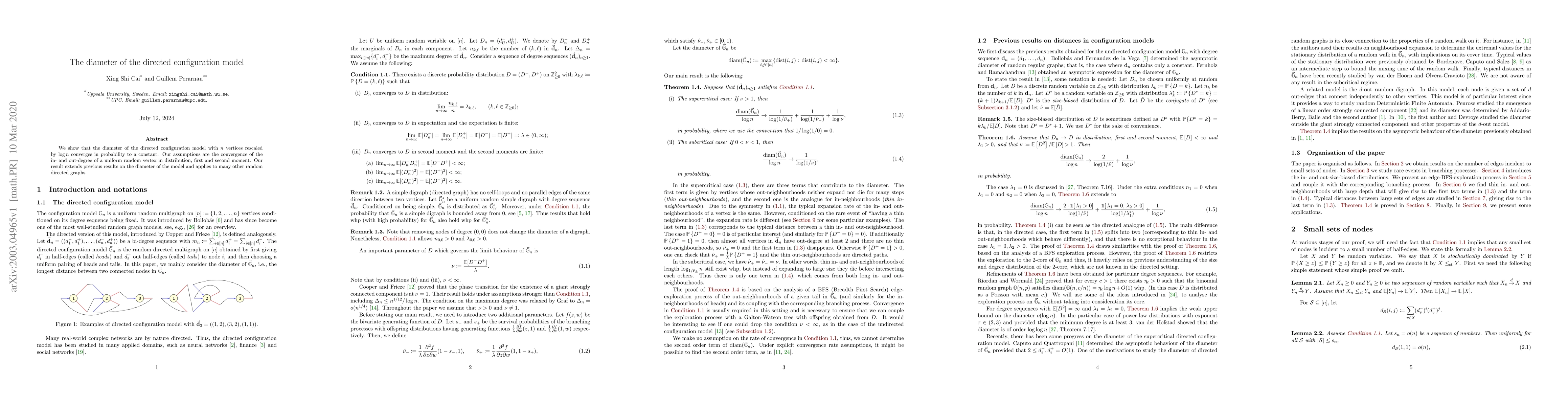 The paper demonstrates that the diameter of the directed configuration model, rescaled by $\log n$, converges in probability to a constant. This result extends previous findings and relies on the convergence of in- and out-degree distributions, along with their first and second moments.