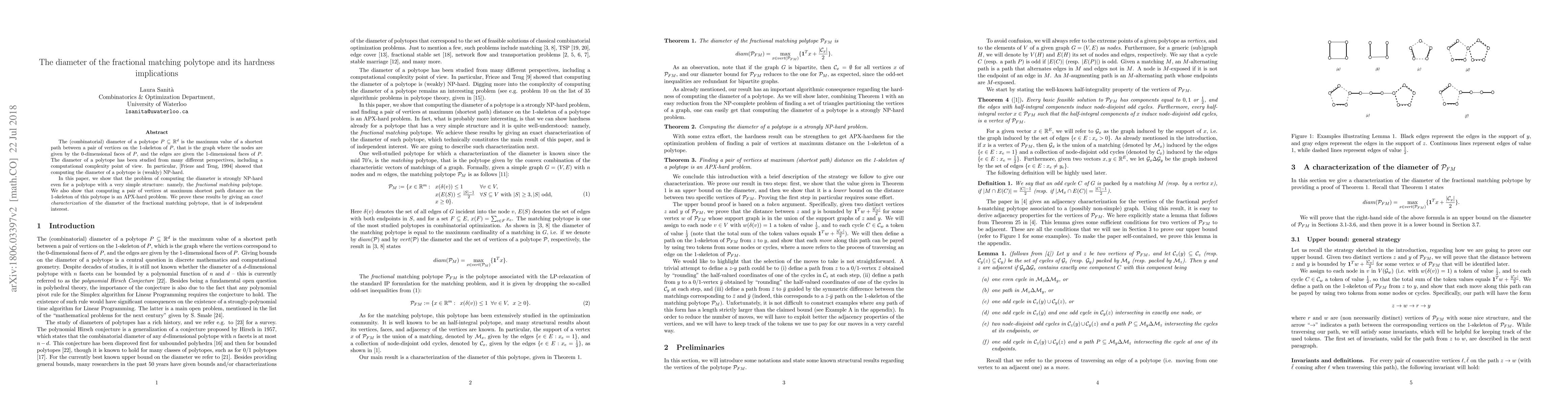 This paper demonstrates that computing the diameter of the fractional matching polytope is strongly NP-hard, even for simple structures, and shows that finding a pair of vertices with maximum shortest path distance is APX-hard. The authors provide an exact characterization of the diameter, which is significant in its own right.