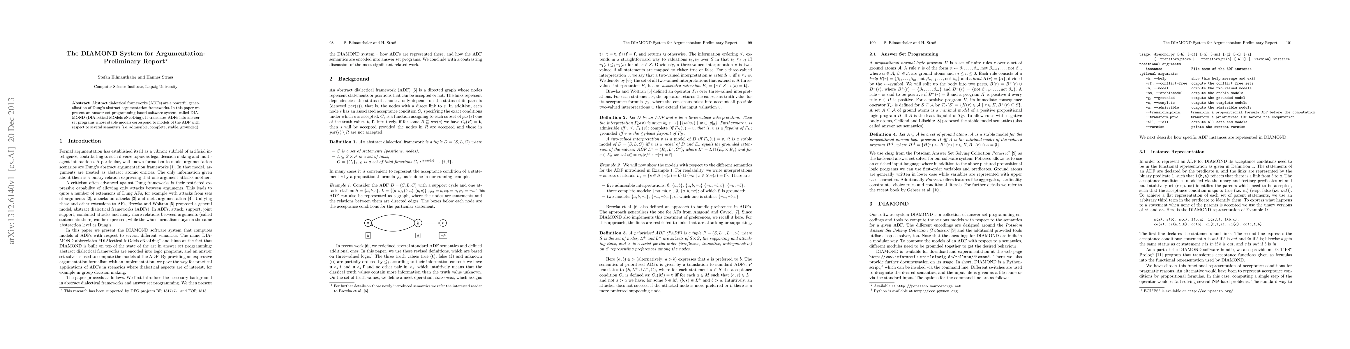The DIAMOND system translates abstract dialectical frameworks into answer set programs, enabling the computation of various argumentation semantics such as admissible, complete, stable, and grounded.