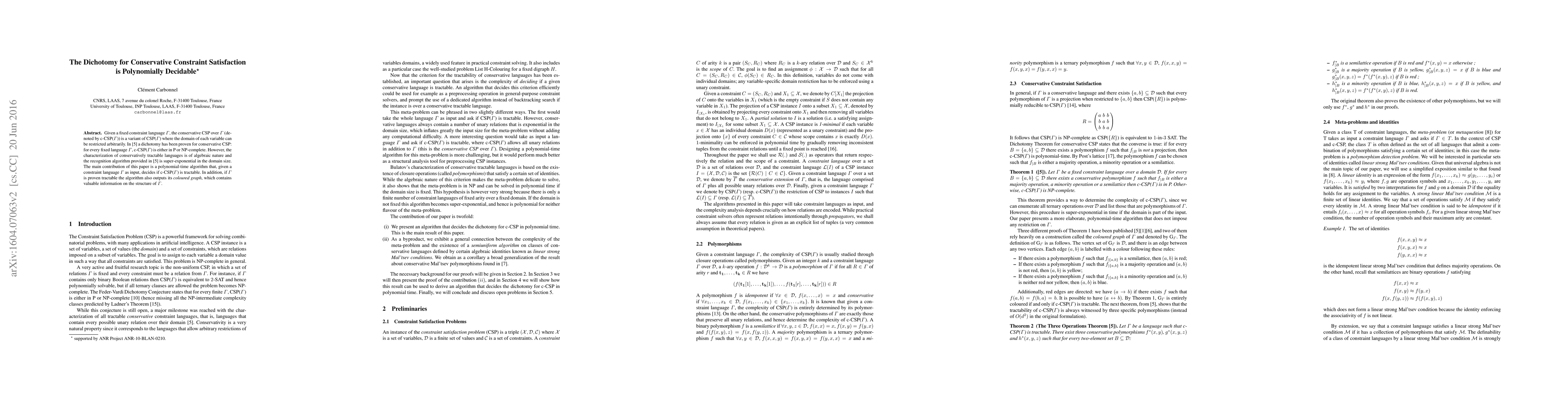 This paper presents a polynomial-time algorithm to determine whether the conservative constraint satisfaction problem (c-CSP) over a fixed constraint language $\Gamma$ is tractable, resolving the dichotomy between tractability and NP-completeness. If tractable, the algorithm also outputs a coloured graph that reveals structural information about $\Gamma$.