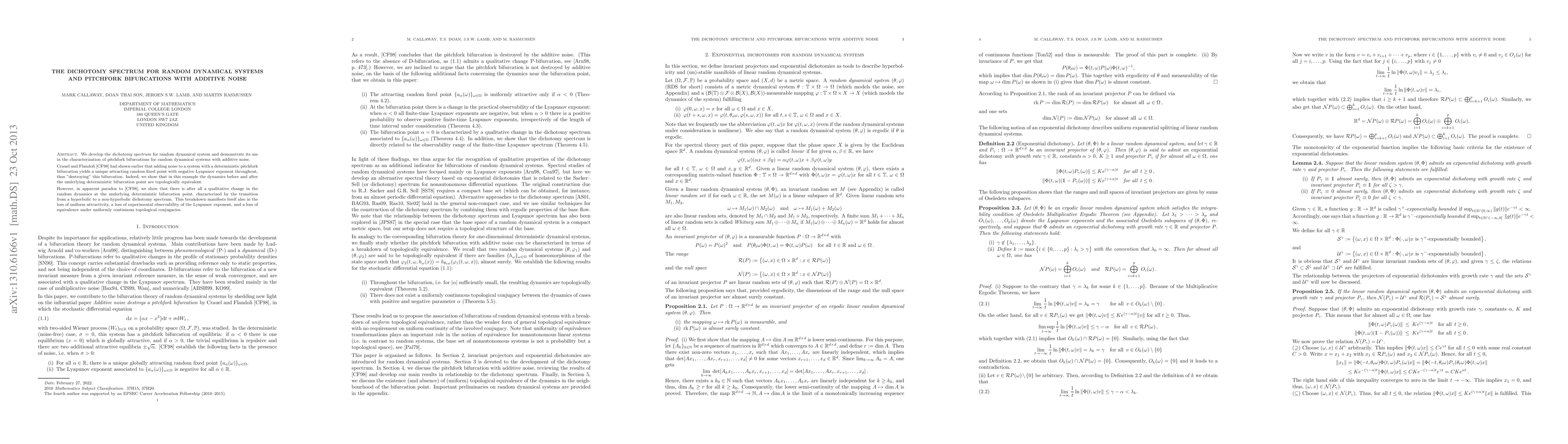 We develop the dichotomy spectrum for random dynamical system and demonstrate its use in the characterization of pitchfork bifurcations for random dynamical systems with additive noise. Crauel and Flandoli had shown earlier that adding noise to a system with a deterministic pitchfork bifurcation yields a unique attracting random fixed point with negative Lyapunov exponent throughout, thus "destroying" this bifurcation. Indeed, we show that in this example the dynamics before and after the underlying deterministic bifurcation point are topologically equivalent. However, in apparent paradox, we show that there is after all a qualitative change in the random dynamics at the underlying deterministic bifurcation point, characterized by the transition from a hyperbolic to a non-hyperbolic dichotomy spectrum. This breakdown manifests itself also in the loss of uniform attractivity, a loss of experimental observability of the Lyapunov exponent, and a loss of equivalence under uniformly continuous topological conjugacies.