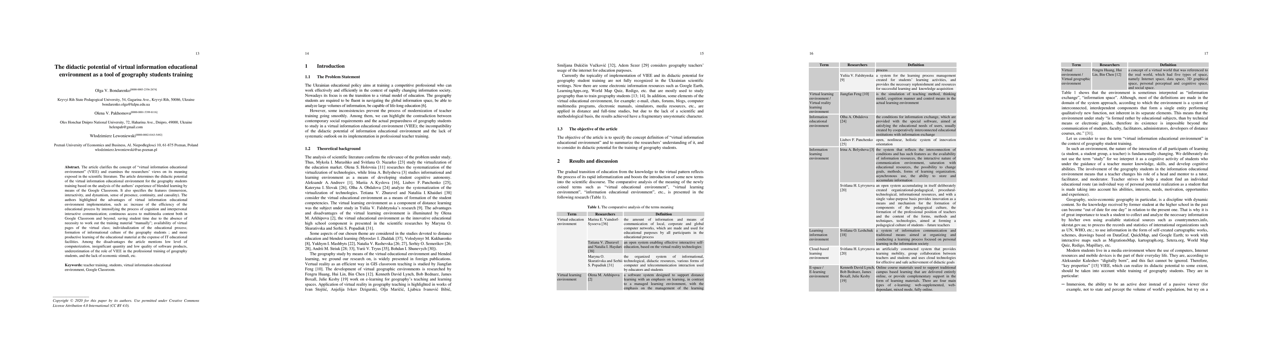 The research clarifies the concept of 'virtual information educational environment' (VIEE) and examines researchers' views on it. It analyzes the authors' experience with blended learning using Google Classroom to determine VIEE's didactic potential for geography students' training.