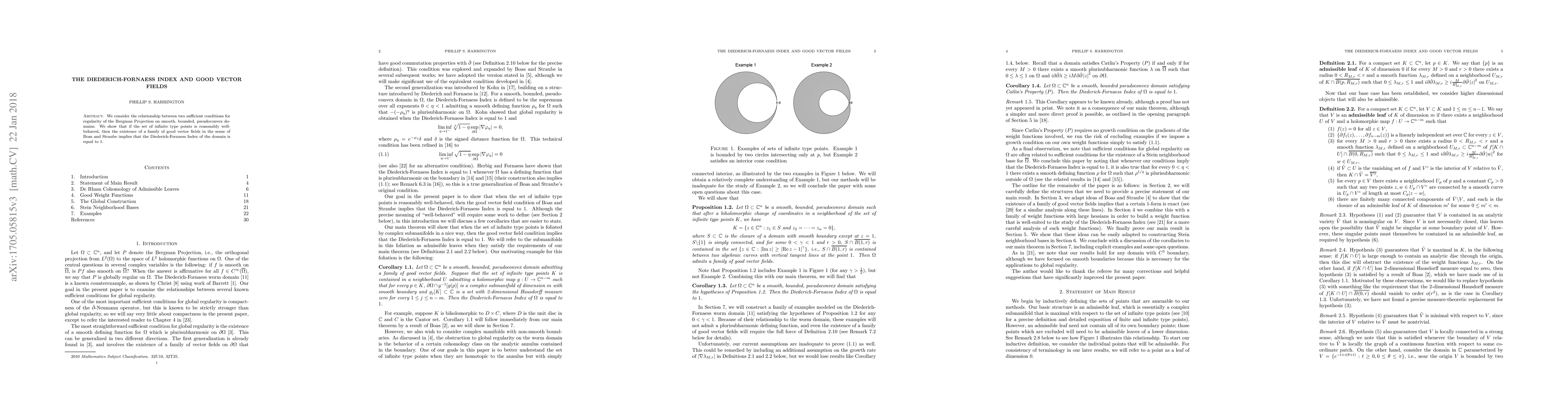 We consider the relationship between two sufficient conditions for regularity of the Bergman Projection on smooth, bounded, pseudoconvex domains. We show that if the set of infinite type points is reasonably well-behaved, then the existence of a family of good vector fields in the sense of Boas and Straube implies that the Diederich-Fornaess Index of the domain is equal to one.