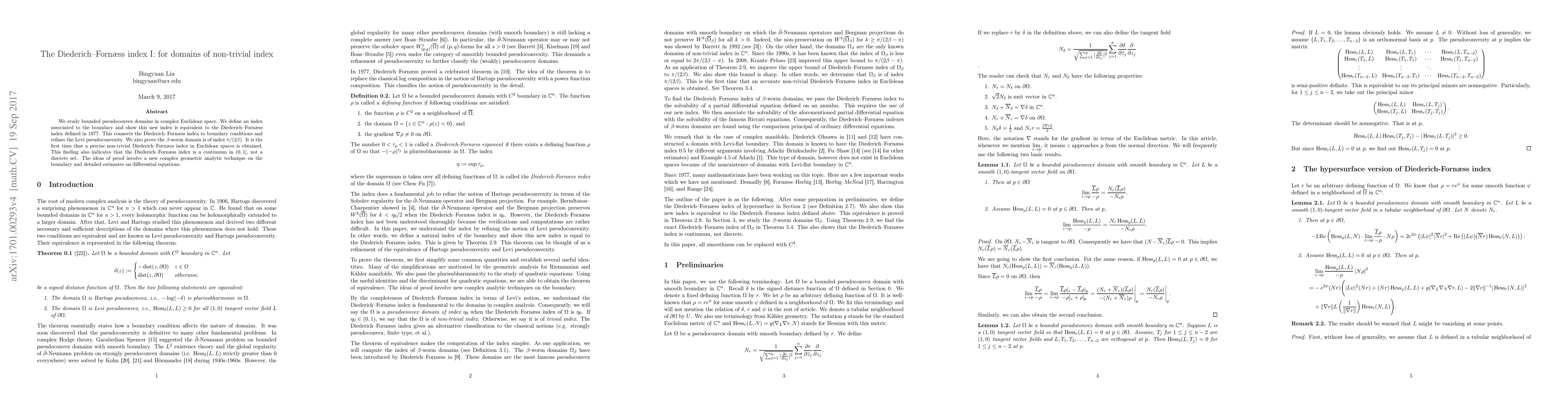 We study bounded pseudoconvex domains in complex Euclidean space. We define an index associated to the boundary and show this new index is equivalent to the Diederich-Forn{\ae}ss index defined in 1977. This connects the Diederich-Forn{\ae}ss index to boundary conditions and refines the Levi pseudoconvexity. We also prove the $\beta$-worm domain is of index $\pi/{(2\beta)}$. It is the first time that a precise non-trivial Diederich-Forn{\ae}ss index in Euclidean spaces is obtained. This finding also indicates that the Diederich-Forn{\ae}ss index is a continuum in $(0,1]$, not a discrete set. The ideas of proof involve a new complex geometric analytic technique on the boundary and detailed estimates on differential equations.