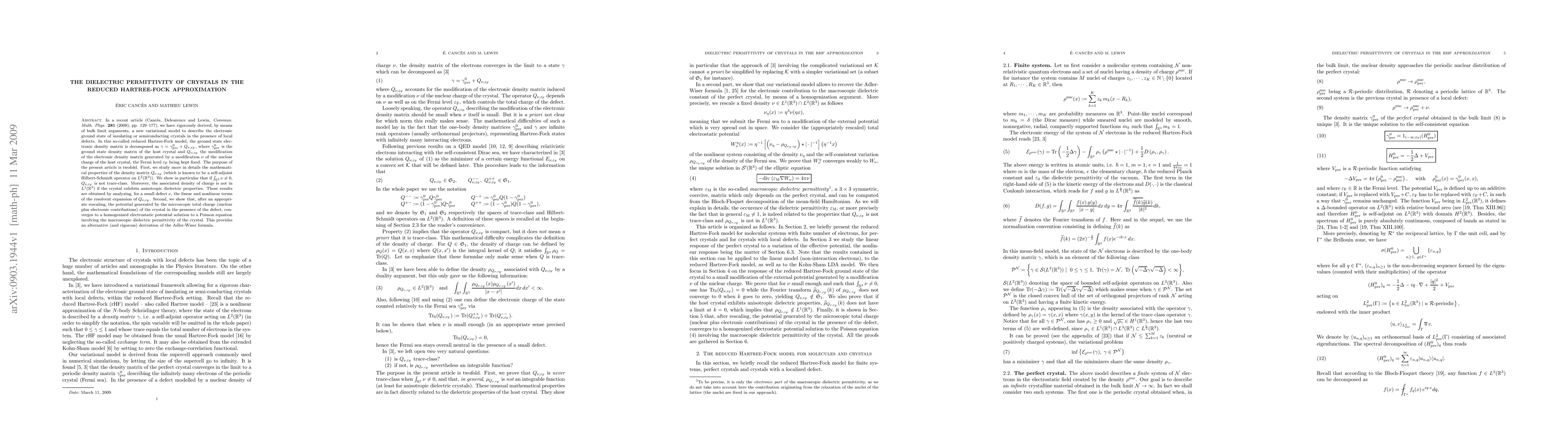 In a recent article (Canc\`es, Deleurence and Lewin, Commun. Math. Phys., 281 (2008), pp. 129-177), we have rigorously derived, by means of bulk limit arguments, a new variational model to describe the electronic ground state of insulating or semiconducting crystals in the presence of local defects. In this so-called reduced Hartree-Fock model, the ground state electronic density matrix is decomposed as $\gamma = \gamma^0_{\rm per} + Q_{\nu,\epsilon_{\rm F}}$, where $\gamma^0_{\rm per}$ is the ground state density matrix of the host crystal and $Q_{\nu,\epsilon_{\rm F}}$ the modification of the electronic density matrix generated by a modification $\nu$ of the nuclear charge of the host crystal, the Fermi level $\epsilon_{\rm F}$ being kept fixed. The purpose of the present article is twofold. First, we study more in details the mathematical properties of the density matrix $Q_{\nu,\epsilon_{\rm F}}$ (which is known to be a self-adjoint Hilbert-Schmidt operator on $L^2(\R^3)$). We show in particular that if $\int_{\RR^3} \nu \neq 0$, $Q_{\nu,\epsilon_{\rm F}}$ is not trace-class. Moreover, the associated density of charge is not in $L^1(\R^3)$ if the crystal exhibits anisotropic dielectric properties. These results are obtained by analyzing, for a small defect $\nu$, the linear and nonlinear terms of the resolvent expansion of $Q_{\nu,\epsilon_{\rm F}}$. Second, we show that, after an appropriate rescaling, the potential generated by the microscopic total charge (nuclear plus electronic contributions) of the crystal in the presence of the defect, converges to a homogenized electrostatic potential solution to a Poisson equation involving the macroscopic dielectric permittivity of the crystal. This provides an alternative (and rigorous) derivation of the Adler-Wiser formula.