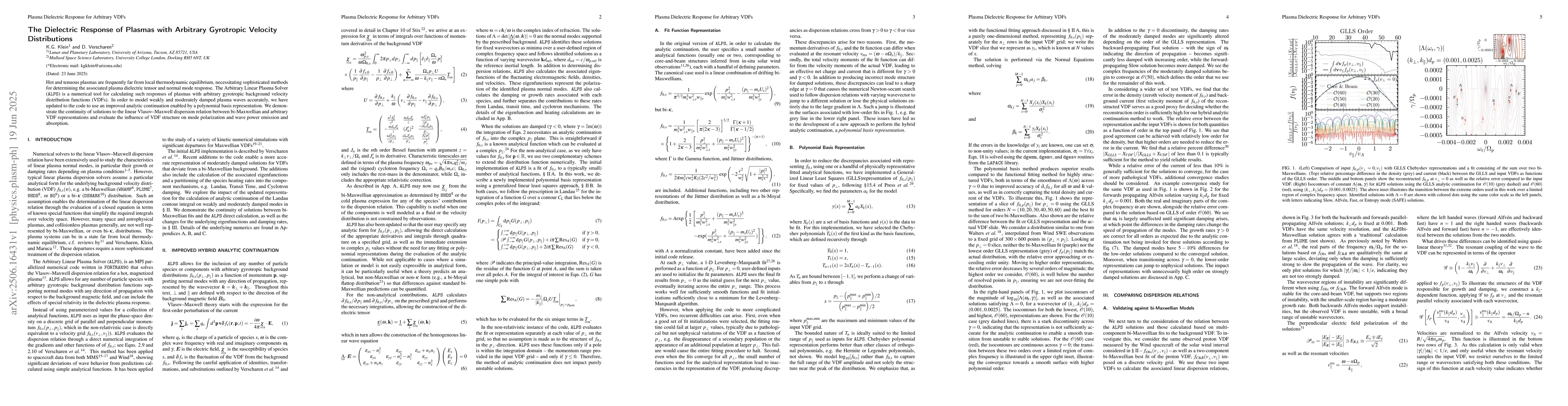 Hot and tenuous plasmas are frequently far from local thermodynamic equilibrium, necessitating sophisticated methods for determining the associated plasma dielectric tensor and normal mode response. The Arbitrary Linear Plasma Solver (\texttt{alps}) is a numerical tool for calculating such responses of plasmas with arbitrary gyrotropic background velocity distribution functions (VDFs). In order to model weakly and moderately damped plasma waves accurately, we have updated to the code to use an improved analytic continuation enabled by a polynomial basis representation. We demonstrate the continuity of solutions to the linear Vlasov--Maxwell dispersion relation between bi-Maxwellian and arbitrary VDF representations and evaluate the influence of VDF structure on mode polarization and wave power emission and absorption.