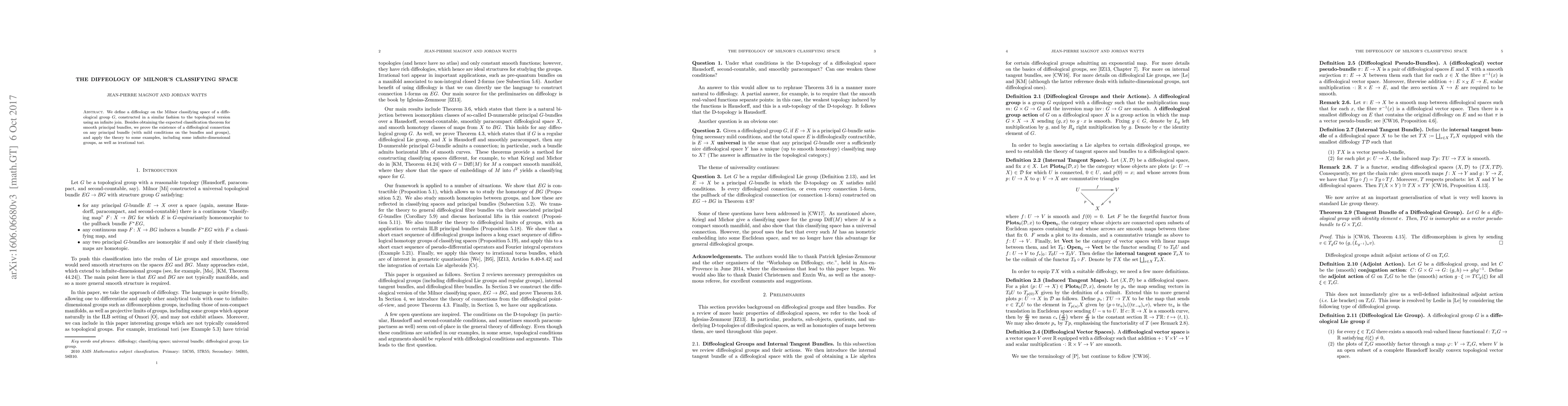 This paper introduces a diffeology on Milnor's classifying space for diffeological groups, derived via an infinite join process. It establishes a classification theorem for smooth principal bundles and proves the existence of diffeological connections under mild conditions, exemplified with applications to infinite-dimensional groups and irrational tori.