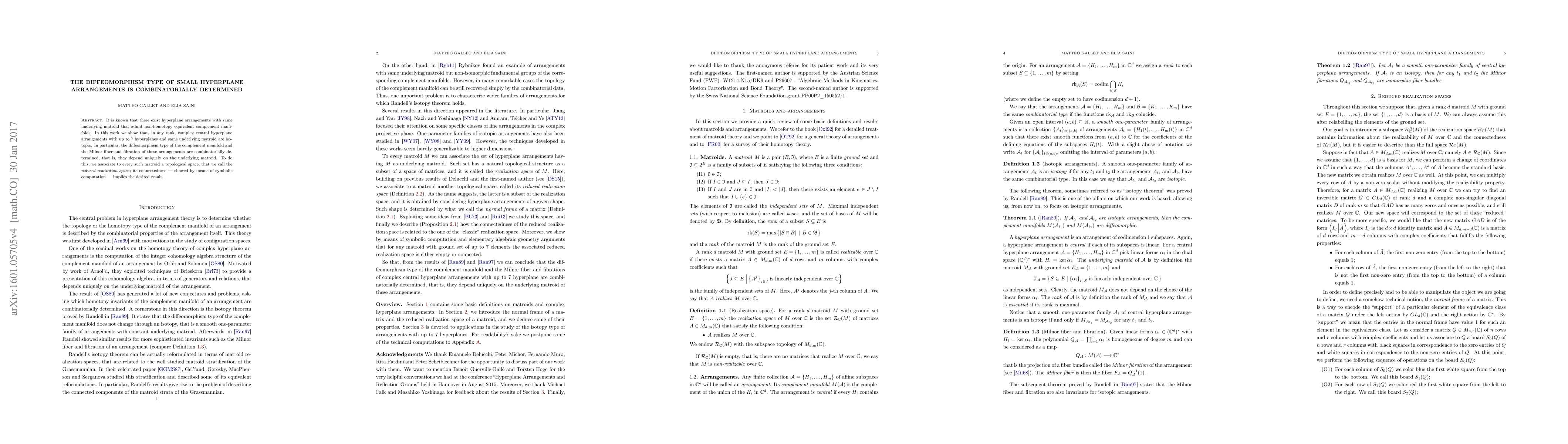 This paper demonstrates that complex central hyperplane arrangements with up to 7 hyperplanes sharing the same underlying matroid are isotopic, thus proving their complement manifolds' diffeomorphism type is combinatorially determined. The study uses symbolic computation to show the connectedness of the reduced realization space associated with each matroid.