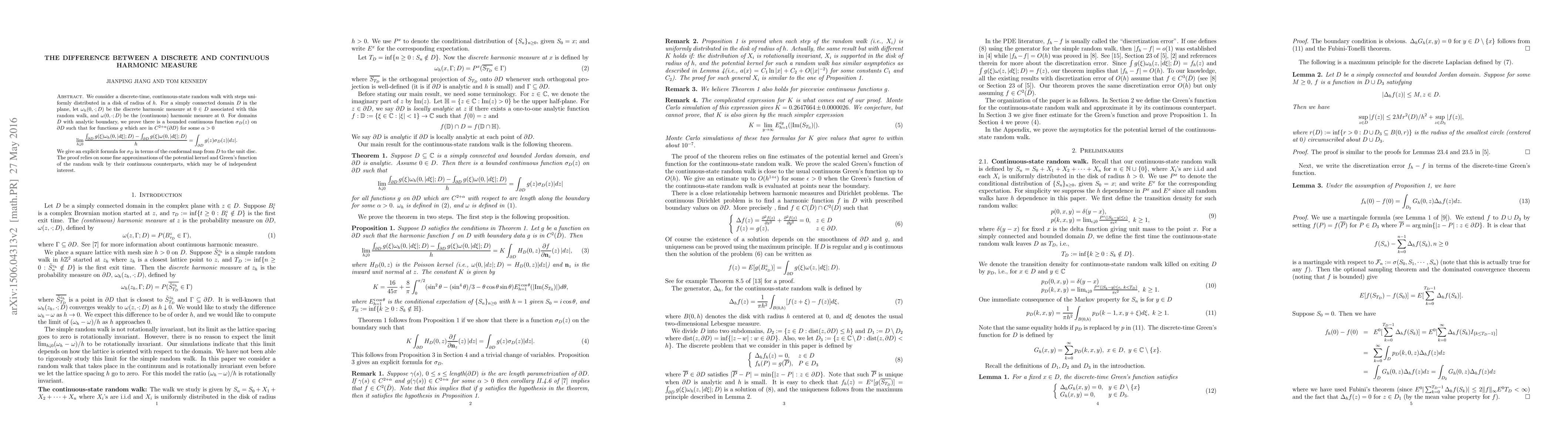 Researchers studied how a random walk on the boundary of a domain approaches a continuous concept as the step size decreases, finding a relationship between the discrete and continuous harmonic measures that depends on the domain's shape and size.