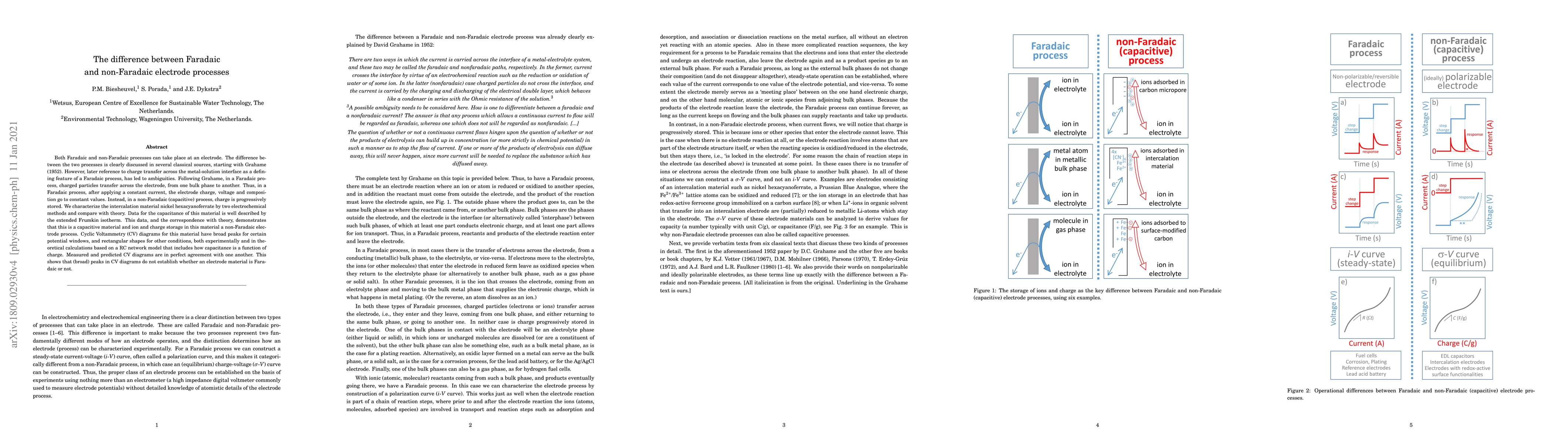 This paper distinguishes between Faradaic and non-Faradaic electrode processes, clarifying that Faradaic involves charge transfer across the electrode, while non-Faradaic (capacitive) involves charge storage. The study characterizes nickel hexacyanoferrate as a capacitive material using electrochemical methods and theory, showing that its behavior aligns with non-Faradaic processes.